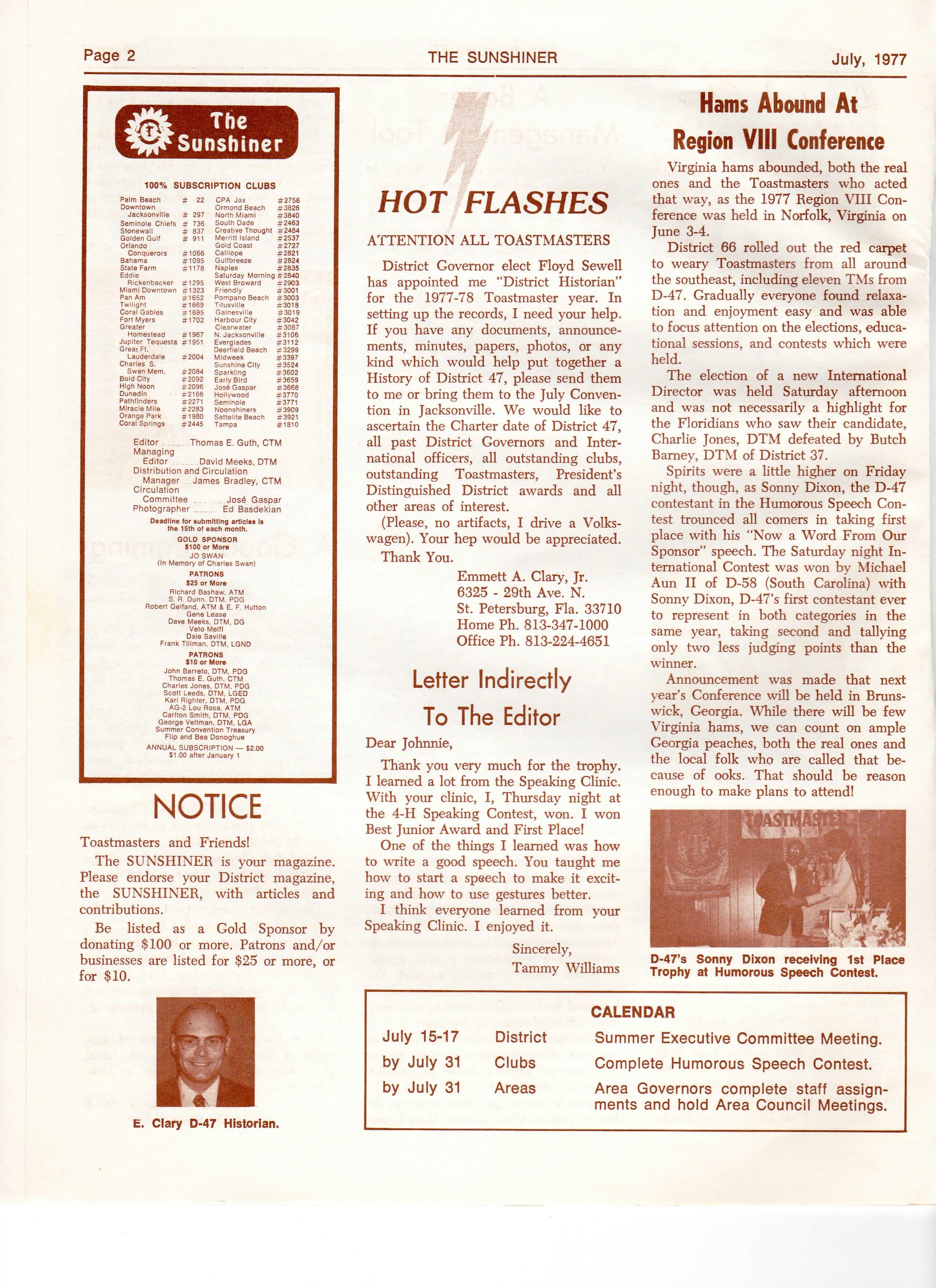 District Governor elect Floyd Sewell has appointed me "District Historian" for the 1977-78 Toastmaster year I n setting up the records, I need your help If you have any documents, announcements, minutes, papers, photos, or any kind which would help put together a History of District 47, please send them to me or bring them to the July Convention i n Jacksonville W e would like t o ascertain the Charter date of District 47, all past District Governors and International officers, all outstanding clubs, outstanding Toastmasters, President's Distinguished District awards and all other areas of interest
