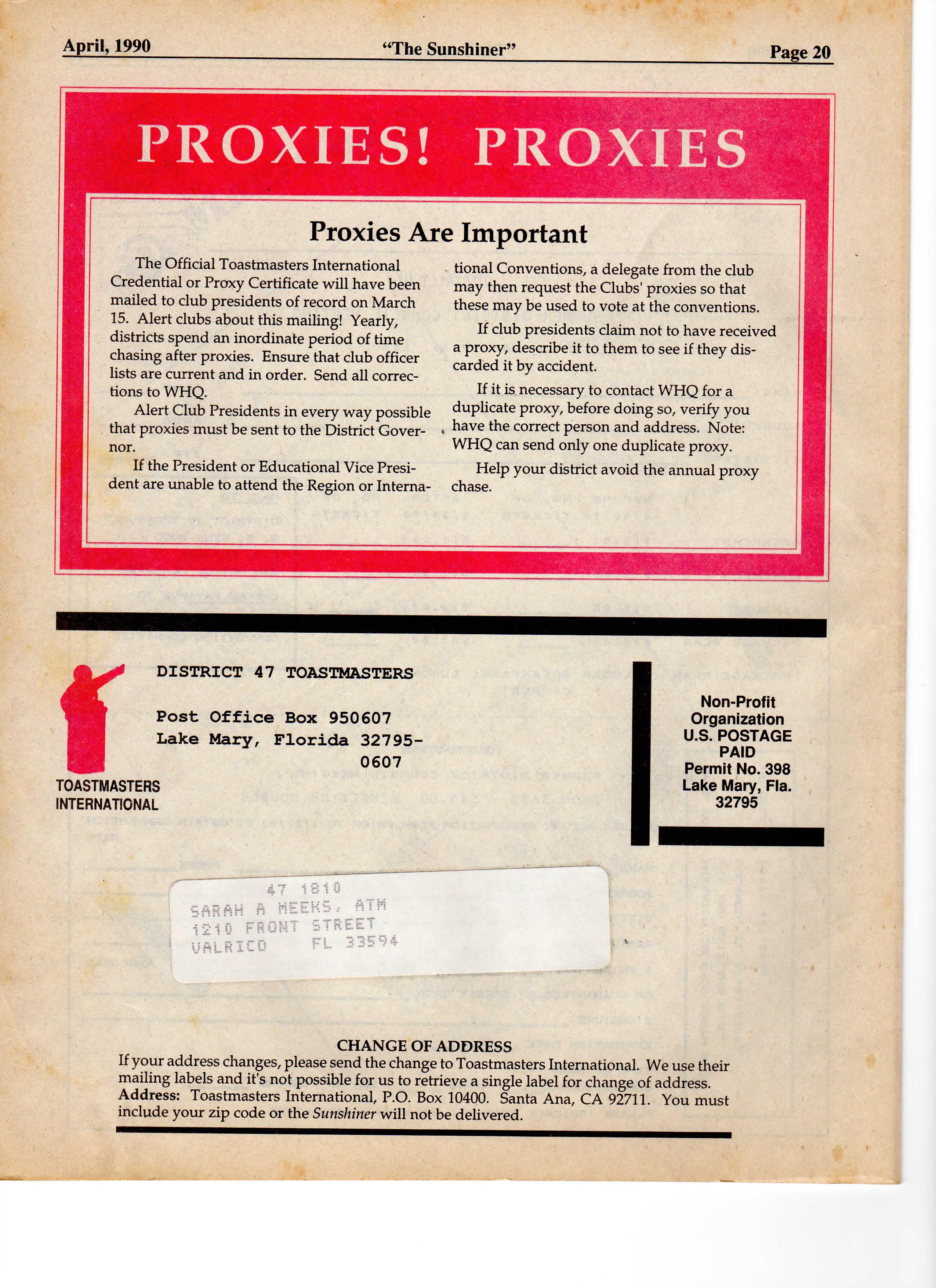 The Official Toastmasters International Credential or Proxy Certificate wil l have been mailed to club presidents of record on March 15 Alert clubs about this mailing! Yearly, districts spend an inordinate period of time chasing after proxies Ensure that club officer lists are current and in order Send all corrections to WHQ