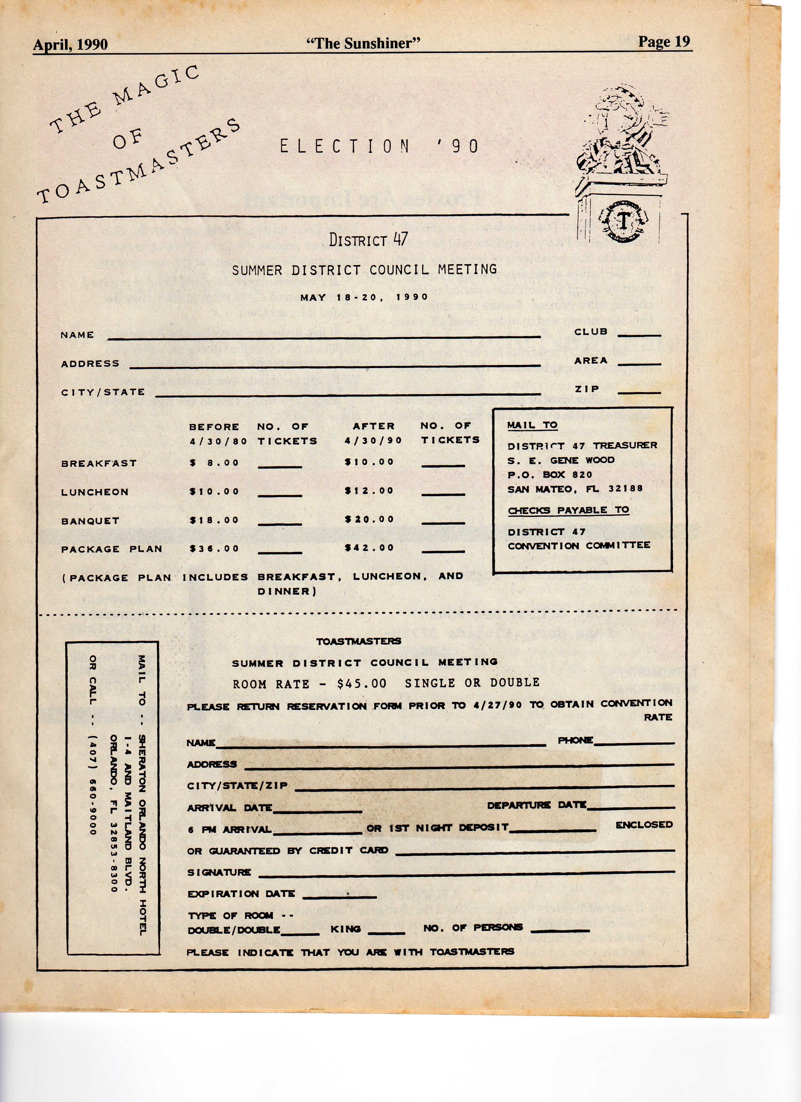 E PLA N INCLUDE S BREAKFAST , LUNCHEON , AN D DINNER ) CLU B ARE A Z I P MAI L T O DISTRIC T 4 7 TREASURER S E GENE WOOD P.O BOX 82 0 SA N MATEO , F L 3218 8 CHECKS PAYABL E TO DISTRIC T 4 7 CONVENTION COMMITTEE TOASTMASTERS SUMME R DISTRIC T COUNCI L MEE T I N O ROOM RATE - $45.0 0 SINGLE OR DOUBLE PLEAS E RETURN RESERVATIO N FORM PRIO R TO 4/27/9 0 TO OBTAI N CONVENTIO N RATE NAME ADDRESS CITY/STATE/ZI P ARRIVA L DATE « PM ARRIVA L DEPARTURE DATE OR 1ST NIGH T DEPOSI T ENCLOSED OR GUARANTEED B Y CREDI T CARD SIGNATUR E EXPIRATIO N DAT E TYP E OF ROOM -DOUBLE/DOUBLE KIN O NO O r PERSONS PLEASE INDICAT E THA T YOU ARE WIT H TOASTMASTERS