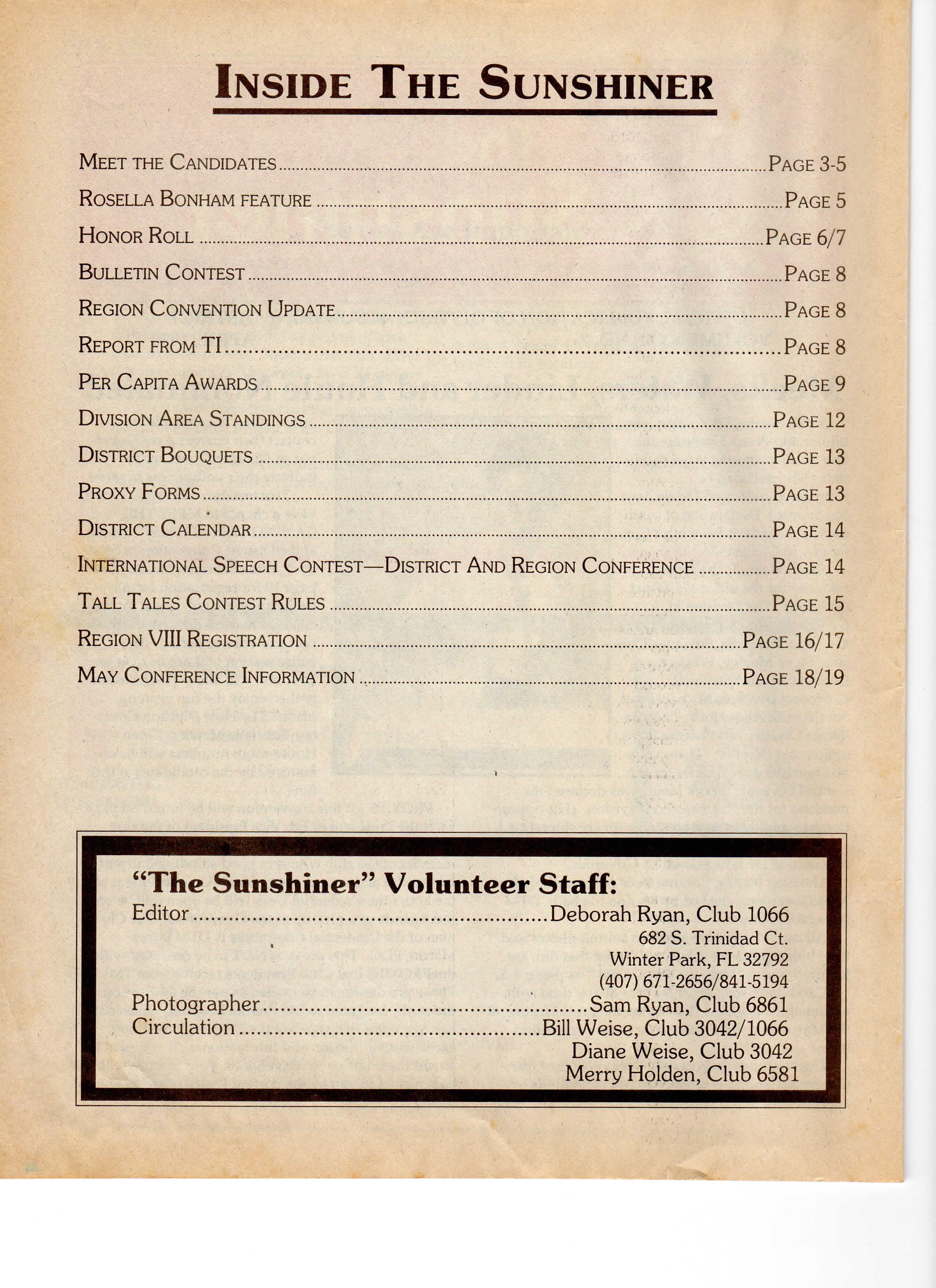 Deborah Ryan, Club 1066 682 S. Trinidad Ct. Winter Park, F L 32792 (407) 671-2656/841-5194 Photographer Sam Ryan, Club 6861 Circulation Bill Weise, Club 3042/1066 Diane Weise, Club 3042 Merry Holden, Club 6581