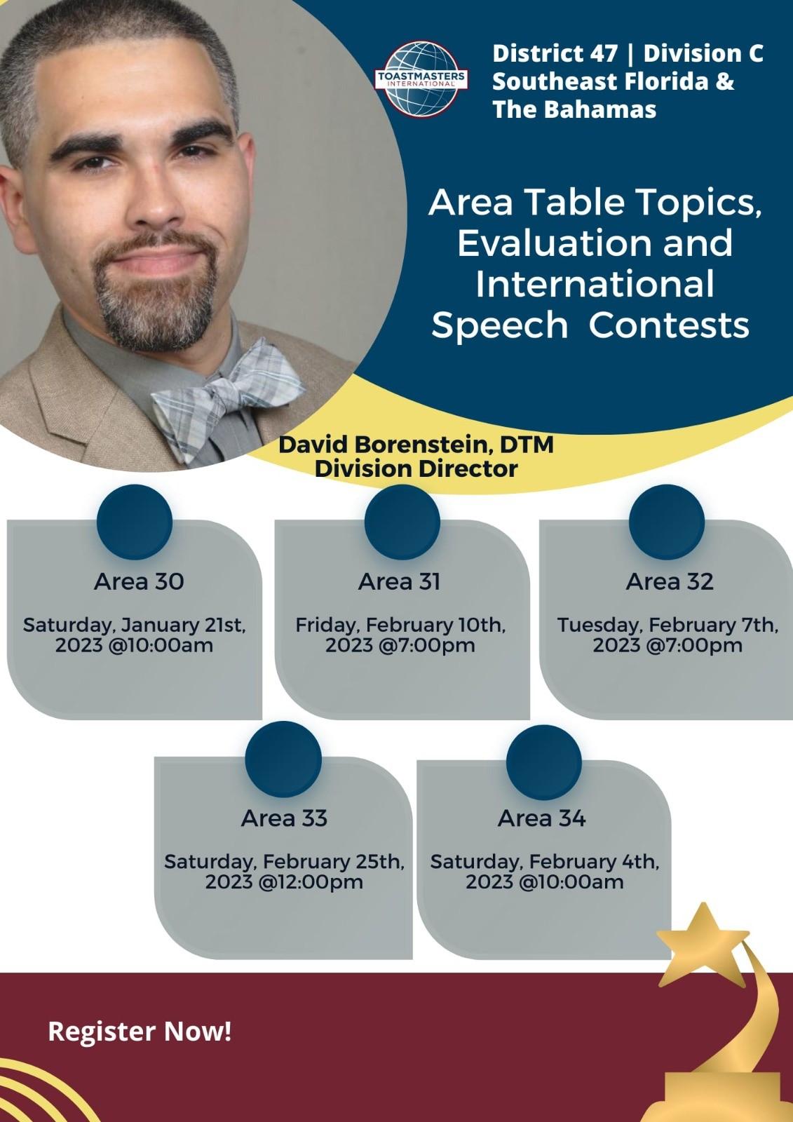 begin 1/15/23, your division and area directors have copies of their flyers with the dates Division Contests are in March