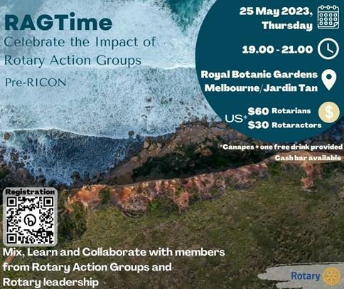 RAGTime - celebrate the impact of Rotary Action Groups and meet with Rotary International Leaders,including a number of past and future RI Presidents (Thursday 25 May, 7 pm to 9 pm AEDT) To register
