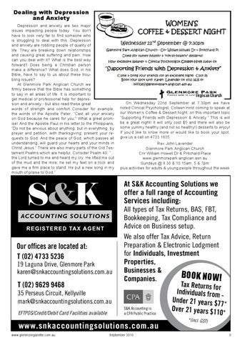 On Wednesday 22nd September at 7.30pm we have noted Clinical Psychologist, Colleen Hirst coming to speak at our Women’s Coffee & Dessert Night, on this important topic “Supporting Friends with Depression & Anxiety.” This is will be a great night! It will only cost $5 and there will also be some yummy healthy (and not so healthy!) desserts to enjoy! If you’d like to know more or would like to book your spot, give us a call on 4733 1635. Rev John Lavender Glenmore Park Anglican Church Cnr William Howell Dr & Pritchard Place www.glenmorepark.anglican.asn.au Sundays @ 8.30 & 10.15am, 5 & 7pm plus activities for adults & young people throughout the week