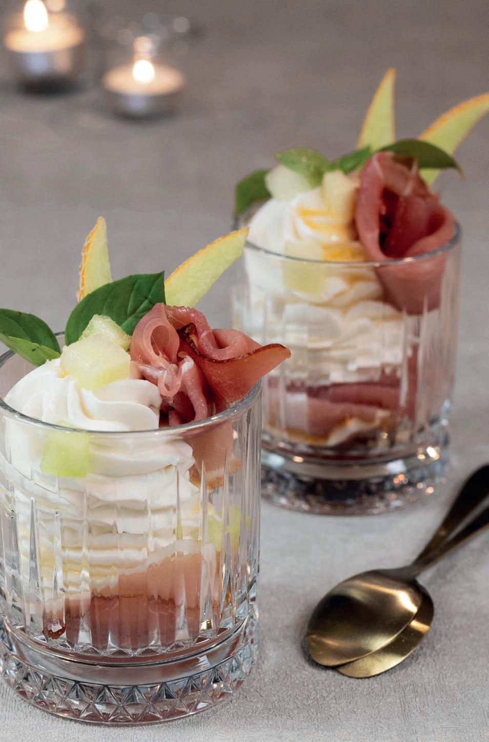 Mix de geitenkaas, bieslook, Skyr, honing en een el olijfolie in een keukenmachine tot een glad en romig geheel ontstaat. Breng het indien nodig op smaak met peper en zout. Verdeel het mengsel over zes glaasjes en zet deze in de koelkast totdat je het gaat serveren. Dit kun je zelfs al een dag van tevoren doen, zodat je het snel kunt serveren wanneer je het nodig hebt. Snijd een galiameloen doormidden en gebruik een meloenbolletjeslepel om minstens 12 bolletjes uit te steken. Voeg bij het opgeklopte geitenkaasmengsel in de glaasjes een plakje ham, de meloenbolletjes en wat verse basilicumblaadjes toe. Maak het geheel af met een beetje peper, zout en een scheutje olijfolie.