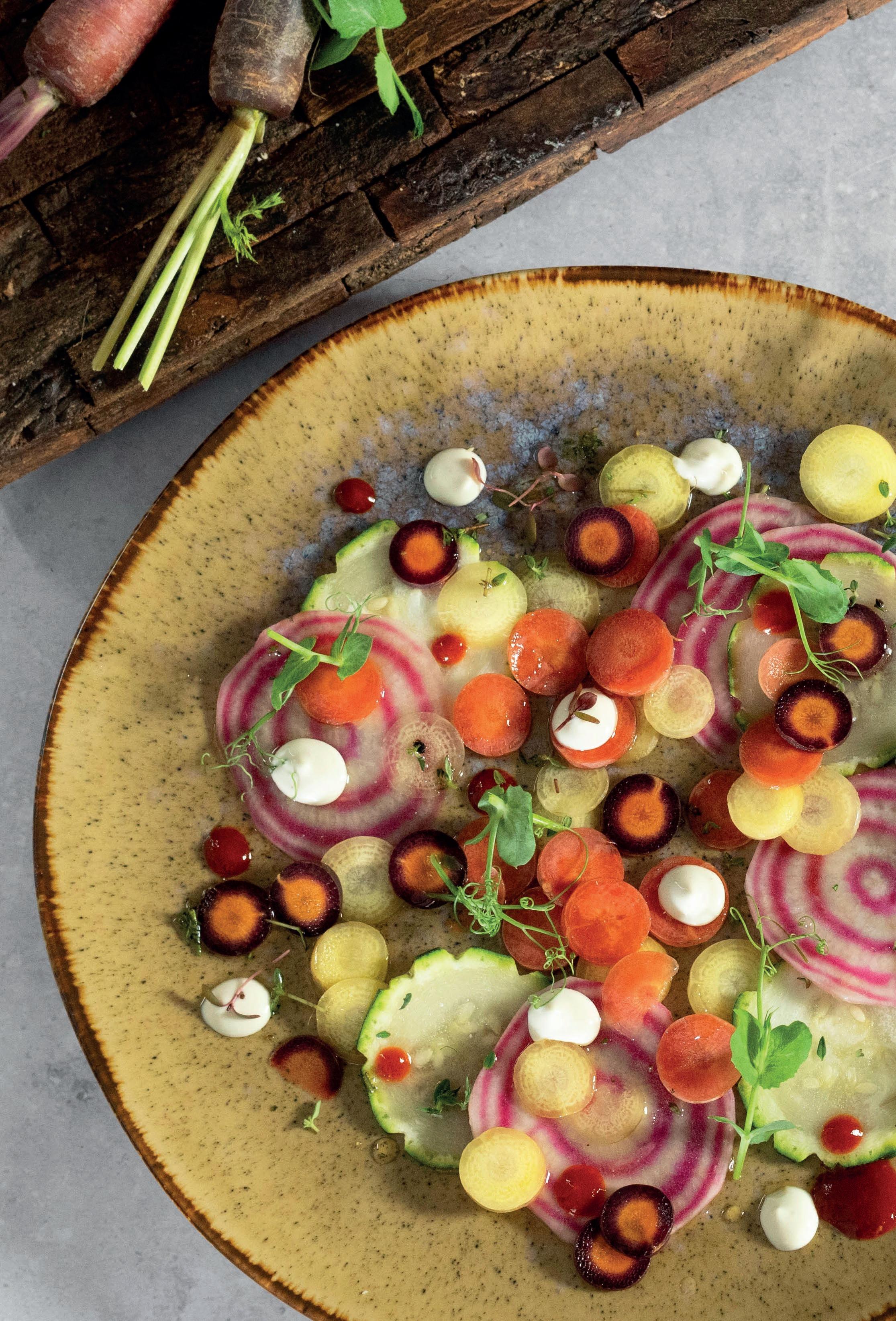 Leg de dunne plakjes groenten mooi dakpansgewijs op de borden. Begin bijvoorbeeld met de wortelen en courgette, gevolgd door de bieten, radijsjes, en rode uienringen. Je kunt de groenten speels over de borden verdelen.