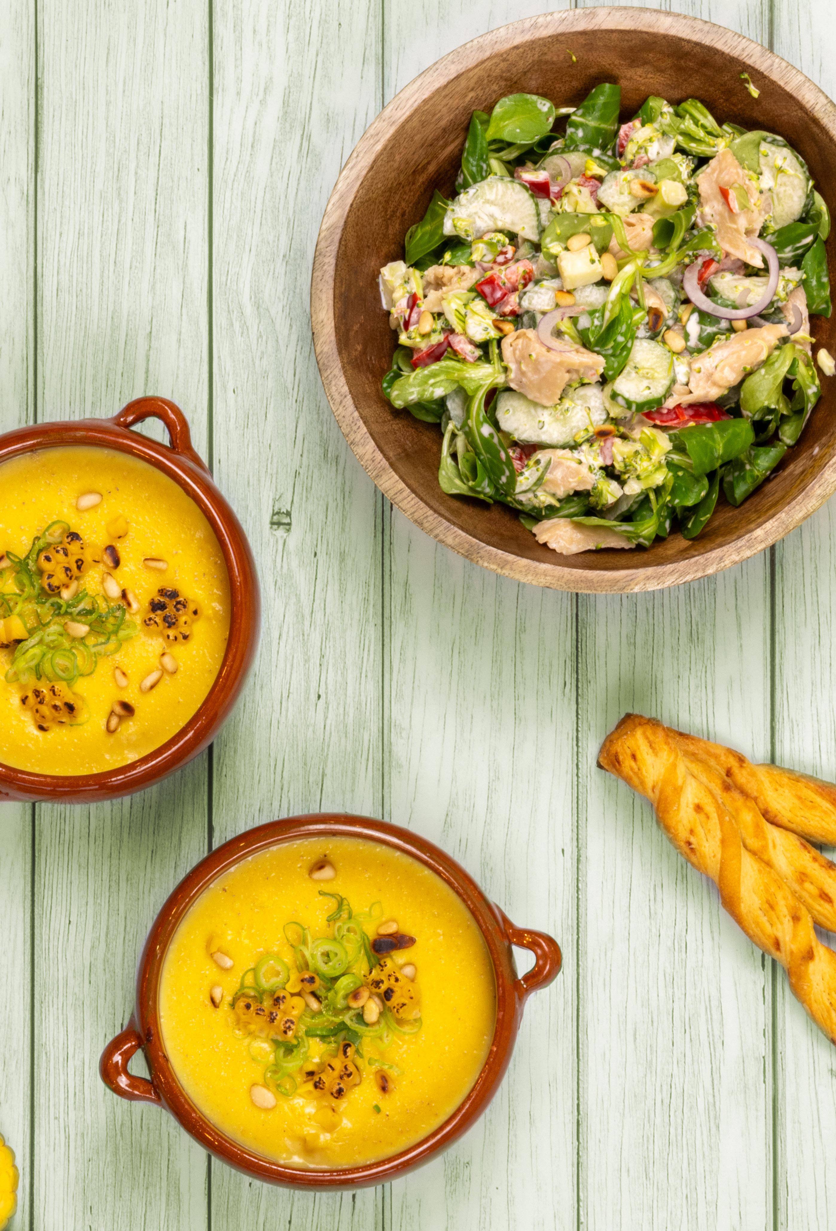 Gebruik een staafmixer om de soep gedeeltelijk te pureren, zodat je een romige textuur krijgt, maar er nog stukjes maïs en aardappel zichtbaar blijven. Dit zorgt voor een mooie balans tussen romigheid en structuur.