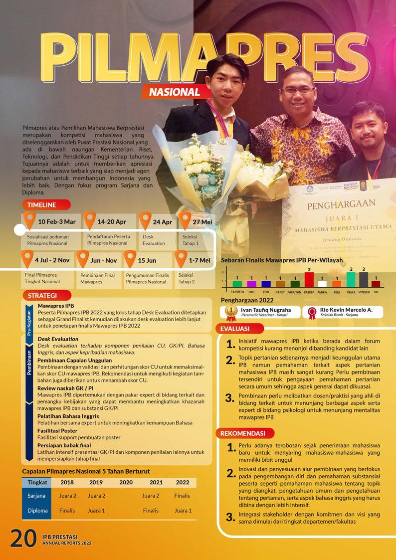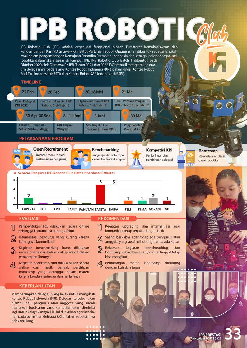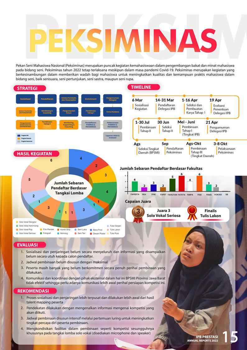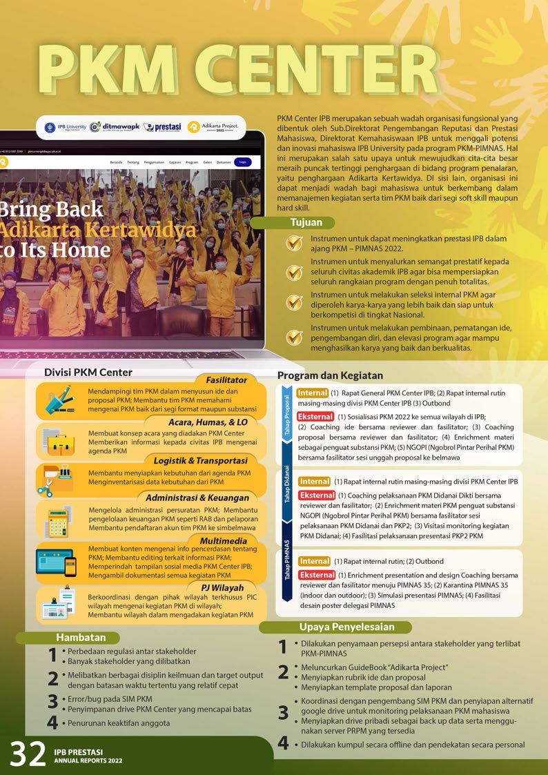 Laporan ini berisi rekap capaian kegiatan dan jgua prestasi mahasiswa yang diraih selama masa 2021 lalu. Dengan berbagai capaian kegiatan dan prestasi yang telah dilaksanakan dan didapatkan. Kami ingin menyampaikan terima kasih kepada para pimpinan IPB, Fakultas/Sekolah dan Departemen, pada pimpinan Lembaga/ Direktorat/Biro/Unit terkait, para dosen pembina/pendamping, para mitra dan donator, pada kasubdit dan staf di direktorat kemahasiswaan dan pengembangan karir IPB yang luar biasa. Serta semua pihak yang telah mendukung dan bekerjasama.