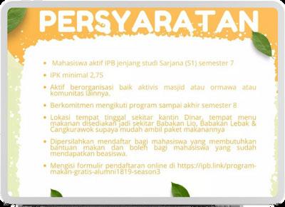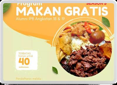 Program bantuan makan gratis ini ditujukan untuk mahasiswa semester 7 dengan kategori tidak mampu dan akan mendapatkan bantuan sampai sidang skripsi. Prosedur untuk mendapatkan bantuan, mahasiswa mendaftar di studentportal.ipb.ac.id.