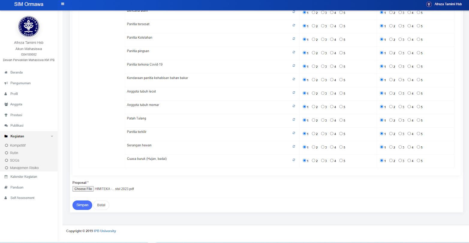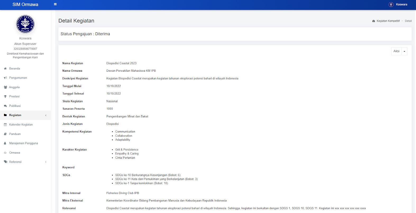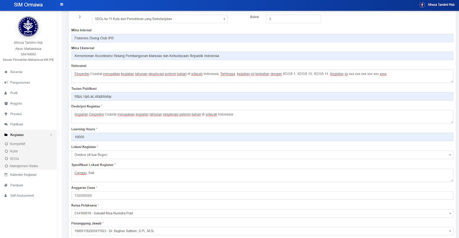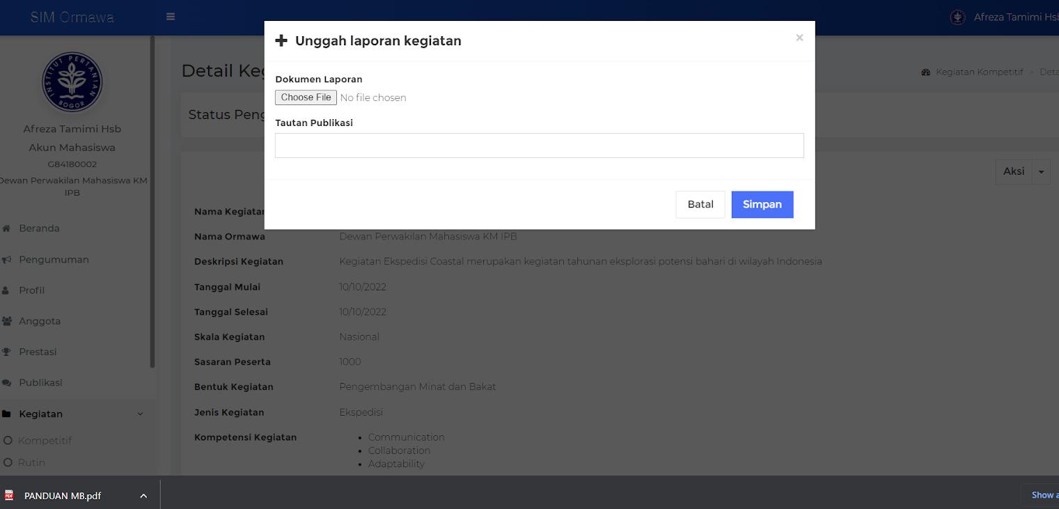 IPB untuk memudahkan organisasi kemahasiswaan IPB dalam sistem persuratan daring dan pengiriman laporan kegiatan organisasi kemahasiswaan (ormawa). Setiap Ormawa IPB memiliki kewajiban untuk melaporkan setiap program kerja yang dilakukan. Pelaporan tersebut terdiri dari proposal kegiatan, laporan pertanggungjawaban, laporan tengah tahun, laporan kegiatan akhir tahun, dan laporan keuangan akhir tahun (Isra 2021). Perguruan tinggi juga diharapkan dapat mengurangi penggunaan kertas di lingkup organisasi kemahasiswaan. Penghematan penggunaan kertas untuk laporan non-keuangan dilakukan dengan pengiriman berkas dalam bentuk softcopy, sedangkan pengiriman laporan keuangan dilakukan dengan mengoptimalisasi jumlah pemakaian kertas secara efektif dan efisien.