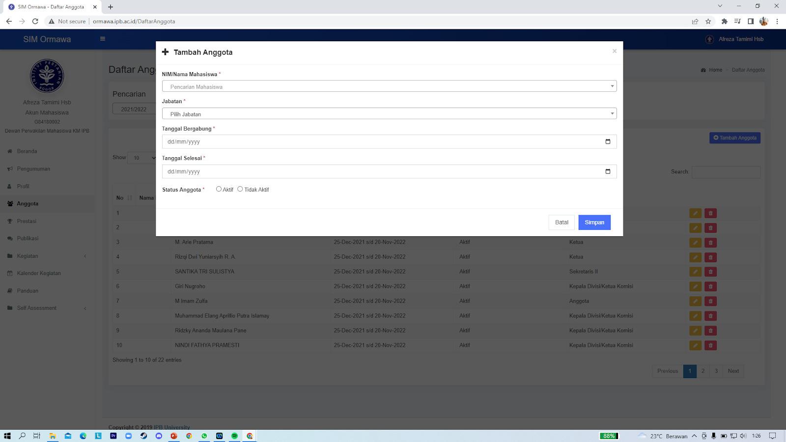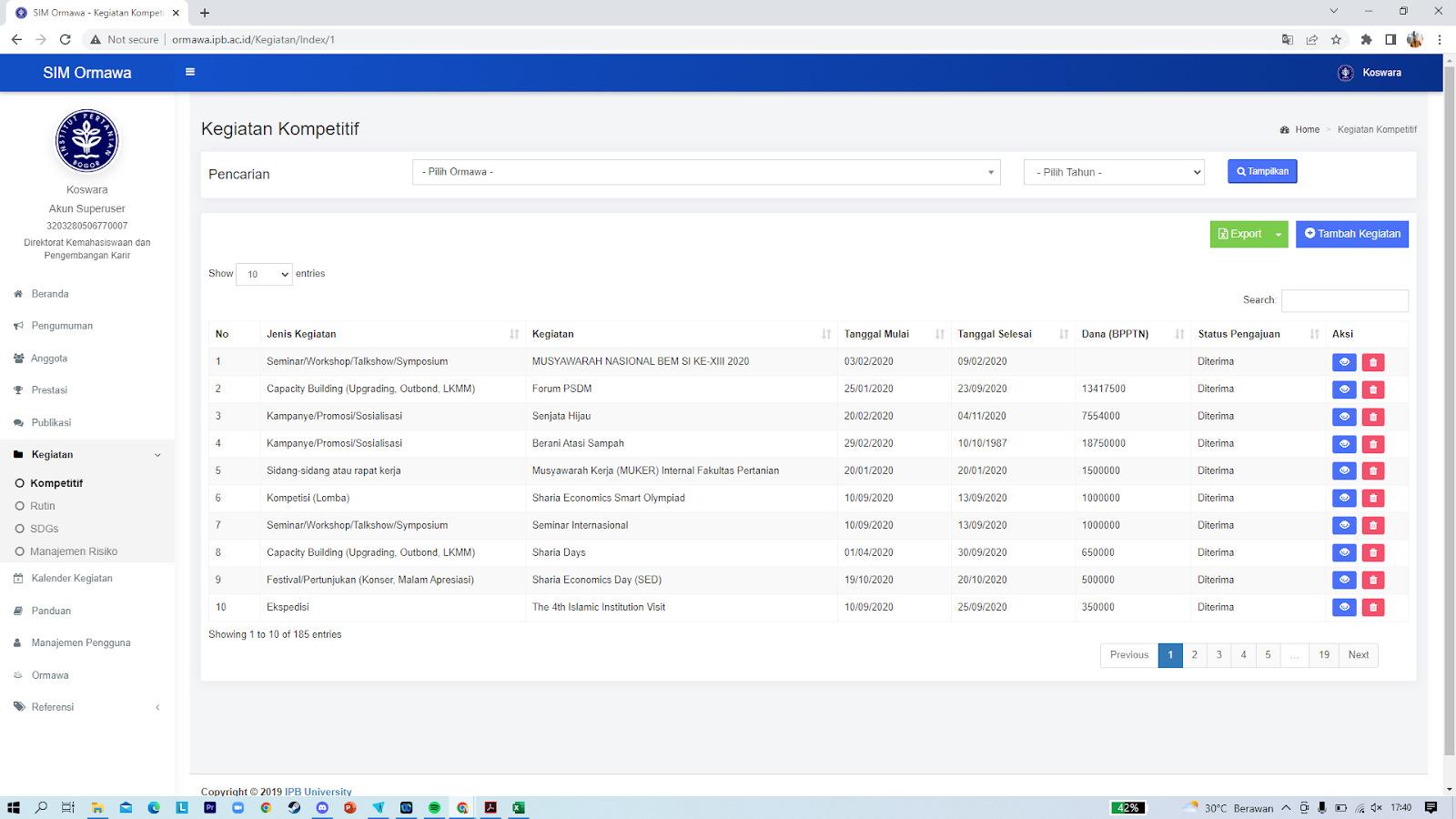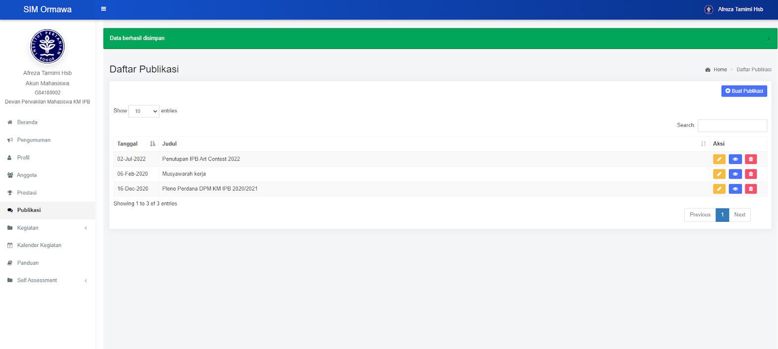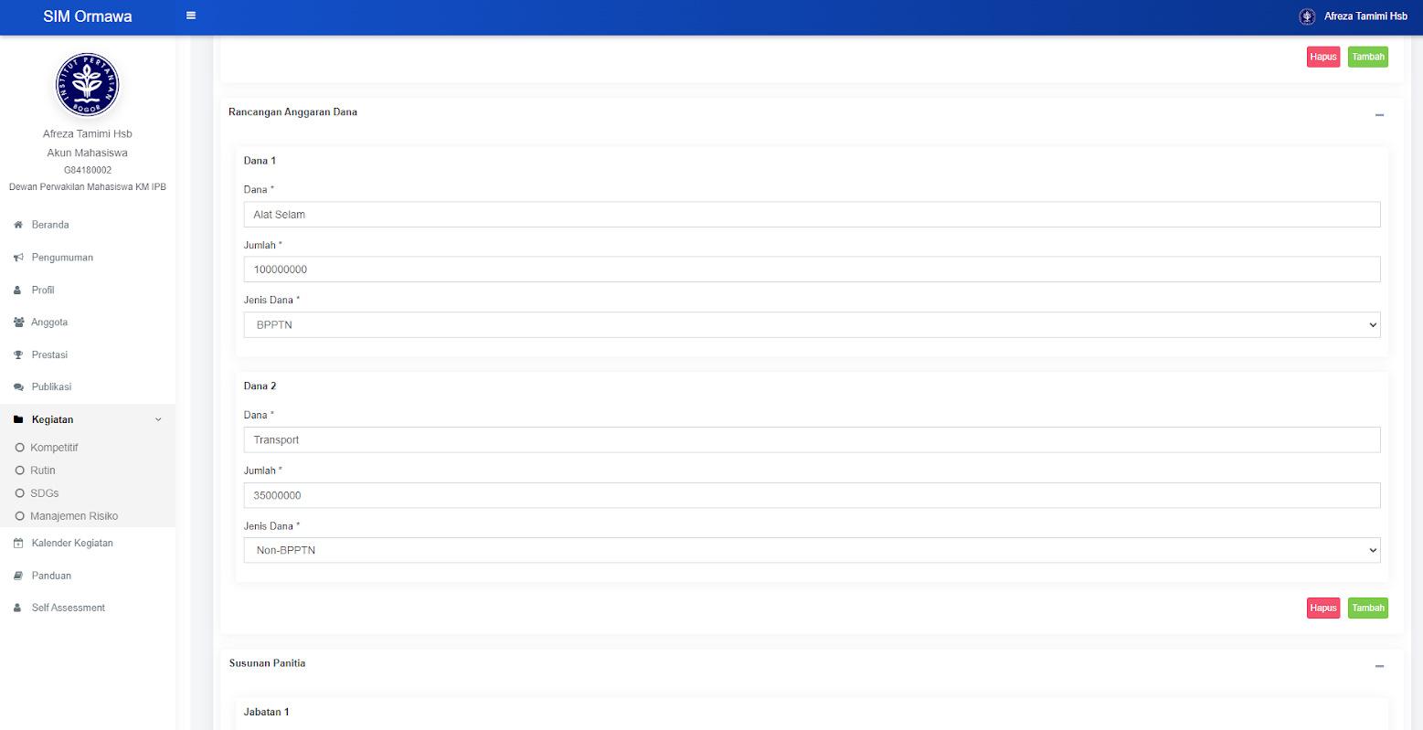 IPB untuk memudahkan organisasi kemahasiswaan IPB dalam sistem persuratan daring dan pengiriman laporan kegiatan organisasi kemahasiswaan (ormawa). Setiap Ormawa IPB memiliki kewajiban untuk melaporkan setiap program kerja yang dilakukan. Pelaporan tersebut terdiri dari proposal kegiatan, laporan pertanggungjawaban, laporan tengah tahun, laporan kegiatan akhir tahun, dan laporan keuangan akhir tahun (Isra 2021). Perguruan tinggi juga diharapkan dapat mengurangi penggunaan kertas di lingkup organisasi kemahasiswaan. Penghematan penggunaan kertas untuk laporan non-keuangan dilakukan dengan pengiriman berkas dalam bentuk softcopy, sedangkan pengiriman laporan keuangan dilakukan dengan mengoptimalisasi jumlah pemakaian kertas secara efektif dan efisien.