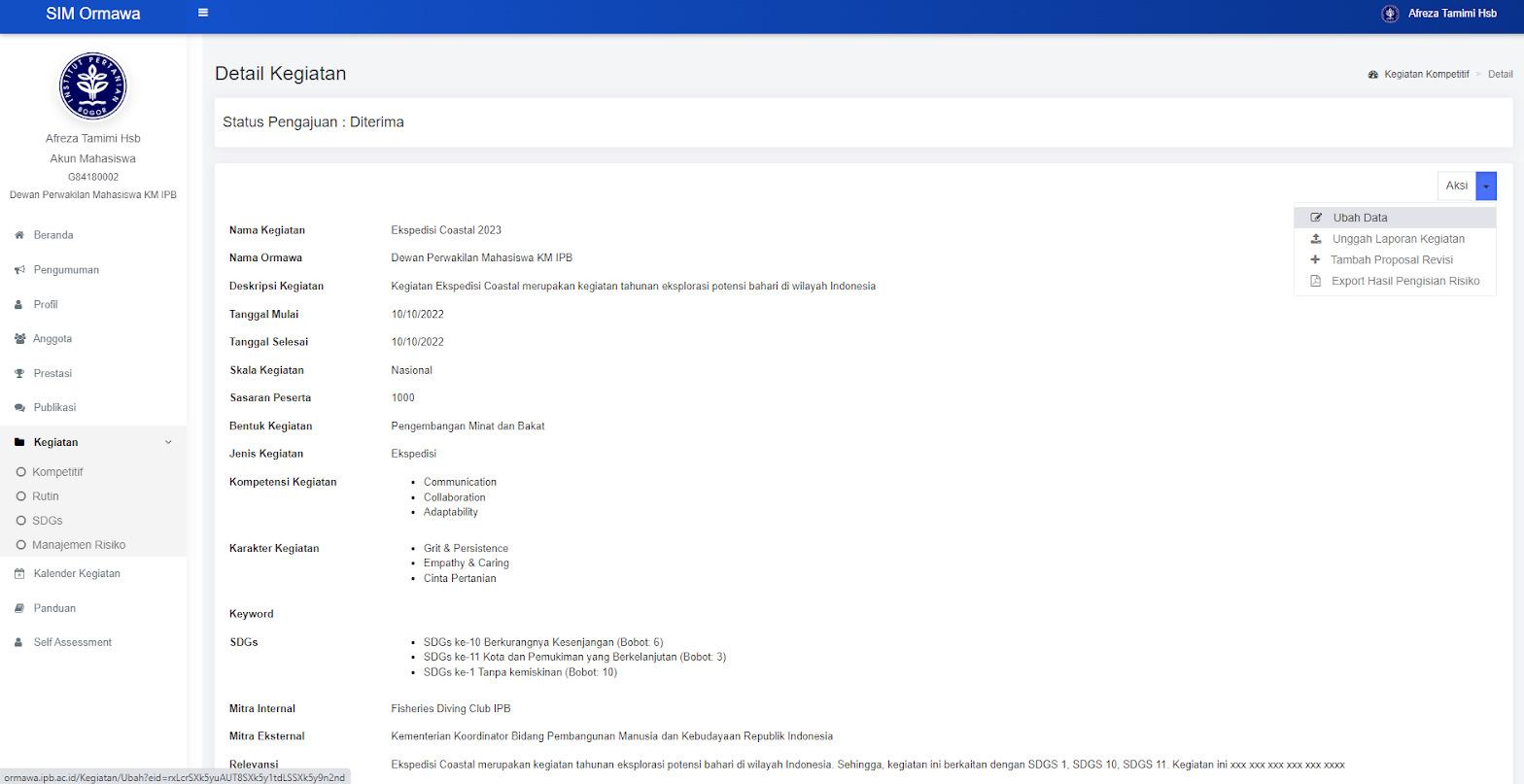 Pengajuan dan pelaporan kegiatan sudah selesai. Jika ada perubahan pada data, dapat dilakukan dengan klik tombol di sebelah aksi pada pojok kanan, lalu pilih Ubah Data.