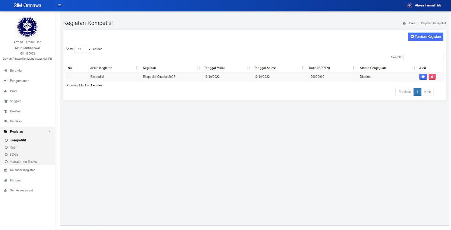 Setelah menu Kegiatan Kompetitif muncul, pilih fitur Tambah Kegiatan pada kolom pojok kanan atas untuk melakukan pengisian data pada proposal kegiatan yang diajukan.
