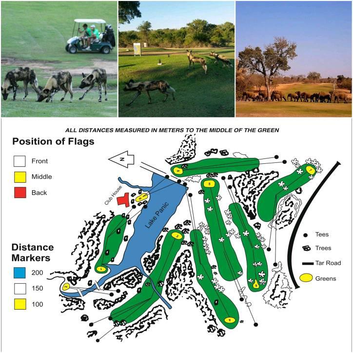 TheSkukuzaGolfCourseisanUNPARALLELED9-hole,18teegolfcourse situatedatSkukuzaCampintheKrugerPark,SouthAfrica.Thecourseasa wholeisaSAGAapprovedstroke71golfcourse.Itisunfencedwhichallowsall sortsofwildlifetomovethroughthearealeadingtoan"outofthisworld"golf game.Onadailybasisthecourseisinundatedwithimpala,kudu,wzrthog, wzterbuck,hippo,crocodileandnyala.Onmanyoccasionsvisitorsofthemore dangerousvariety,suchaslion,leopard,buffaloandelephant,makean appearance!Generally,these"wildspectators"aresilentonyourbackswing!
