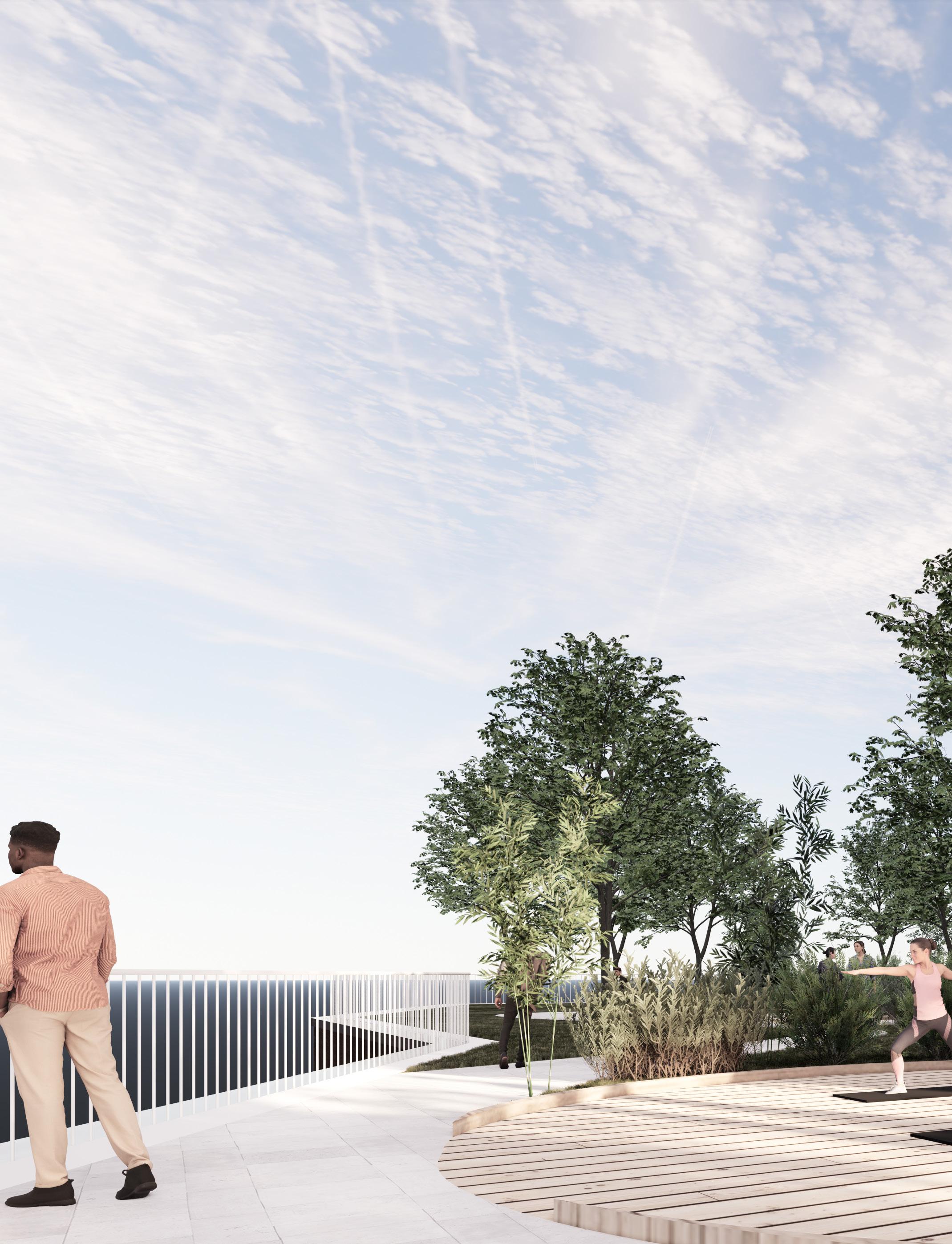 På taget er der mulighed for at skabe et grønt åndehul med indskudte haver, udendørs mødepavilloner, løberuter, yogaspots og køkkenhave til husets frokostrestaurant.