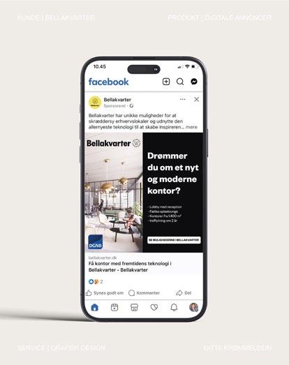 • Kreativ konceptudvikling: Udvikling af visuelle koncepter, kreative budskaber og CTA’er til digitale og offline kampagner med fokus på branding af Bellakvarter samt udlejning af boligog erhvervsejendomme.
