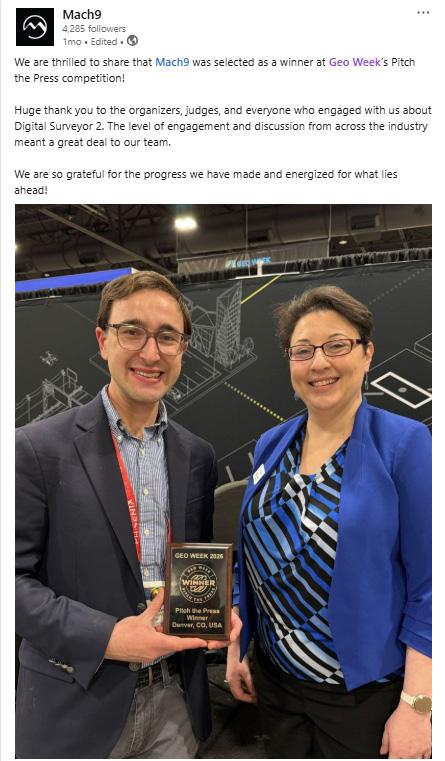 lidar scanning solution, emphasizing its NDAA compliance in combination with its quality and affordability. Finally, Mach9 stood out, presenting its Digital Surveyor 2 platform that significantly speeds up infrastructure workflows by leveraging AI for feature extraction, assistance in drafting designs, and more.