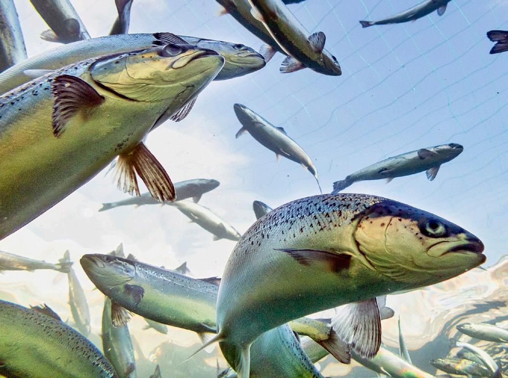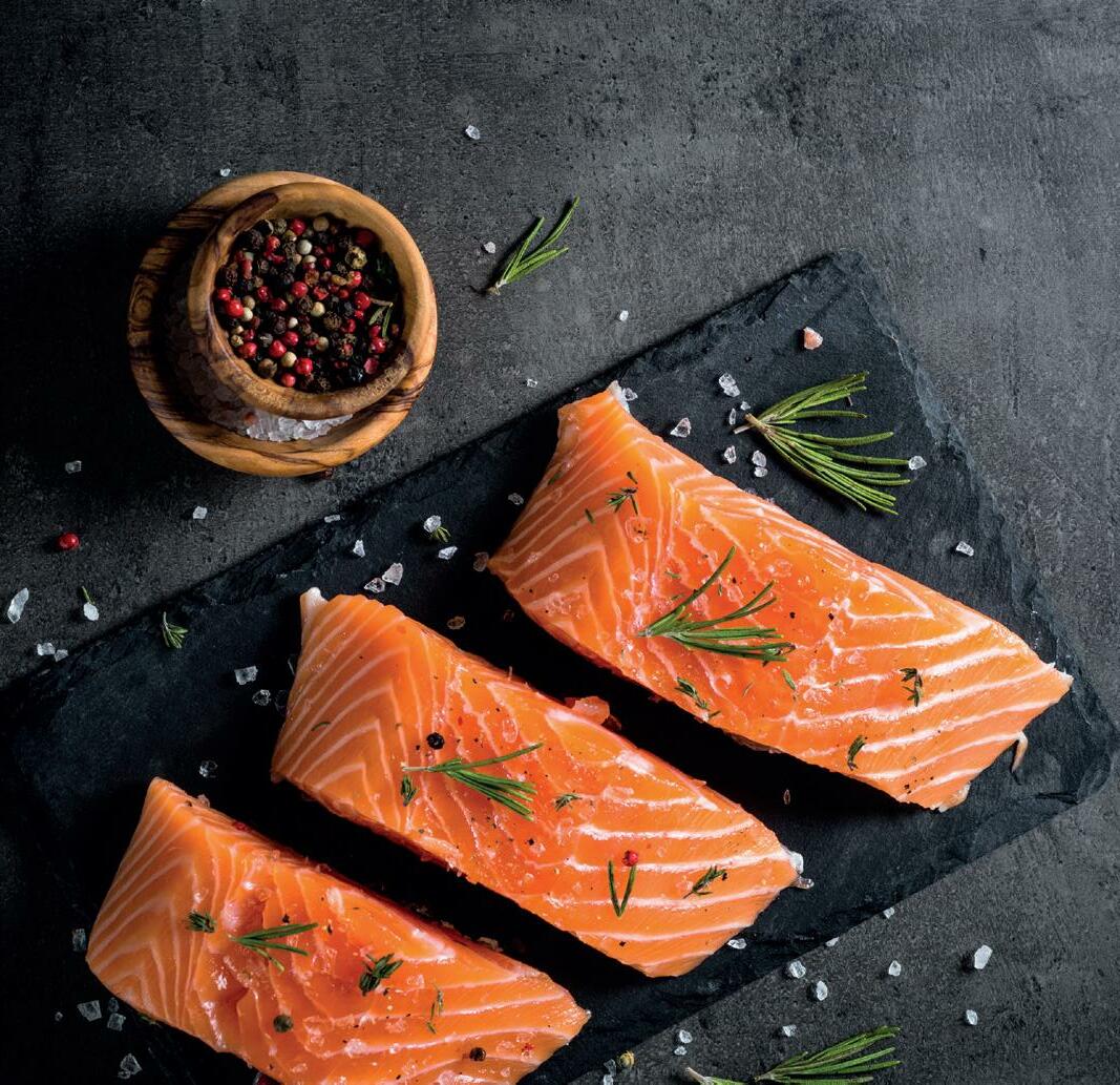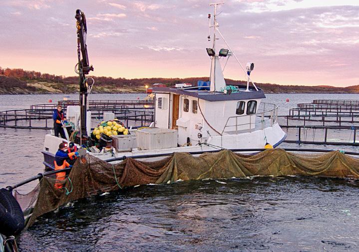 Hvert år forsyner den globale sjø matnæringen verden med 215 millioner tonn sjømat fra villfiske og akvakultur. Andelen fra akvakultur øker, og står nå for over halvparten av den globale pro duksjonen. Rundt 53 millioner tonn blir produsert i innlandsvann, over 68 millio ner tonn i marine og kystnære strøk. Om vi kun holder oss til marint og kystnært oppdrett, snakker vi om over 350 ulike oppdrettsarter. Og her, mellom sjøgress, skalldyr og bløtdyr, finner vi et relativt lite antall fiskearter hvor atlantisk laks står for ca. 60 prosent av totalproduk sjonen, eller nærmere 3 millioner tonn. Poenget er; oppdrettsfisk produsert i havet står for en bitte liten andel av verdens matbord. Atlantisk laks for enda mindre. Til sammenligning blir det hvert år produsert over 350 millioner tonn kjøtt på land, hvorav 70 prosent rødt!