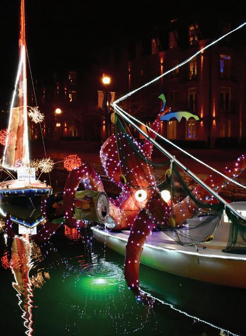 The festively lit boats of Sailing Through the Winter Solstice offer a warm glow— at least in appearance—on a cold evening in Carroll Creek Park. FM