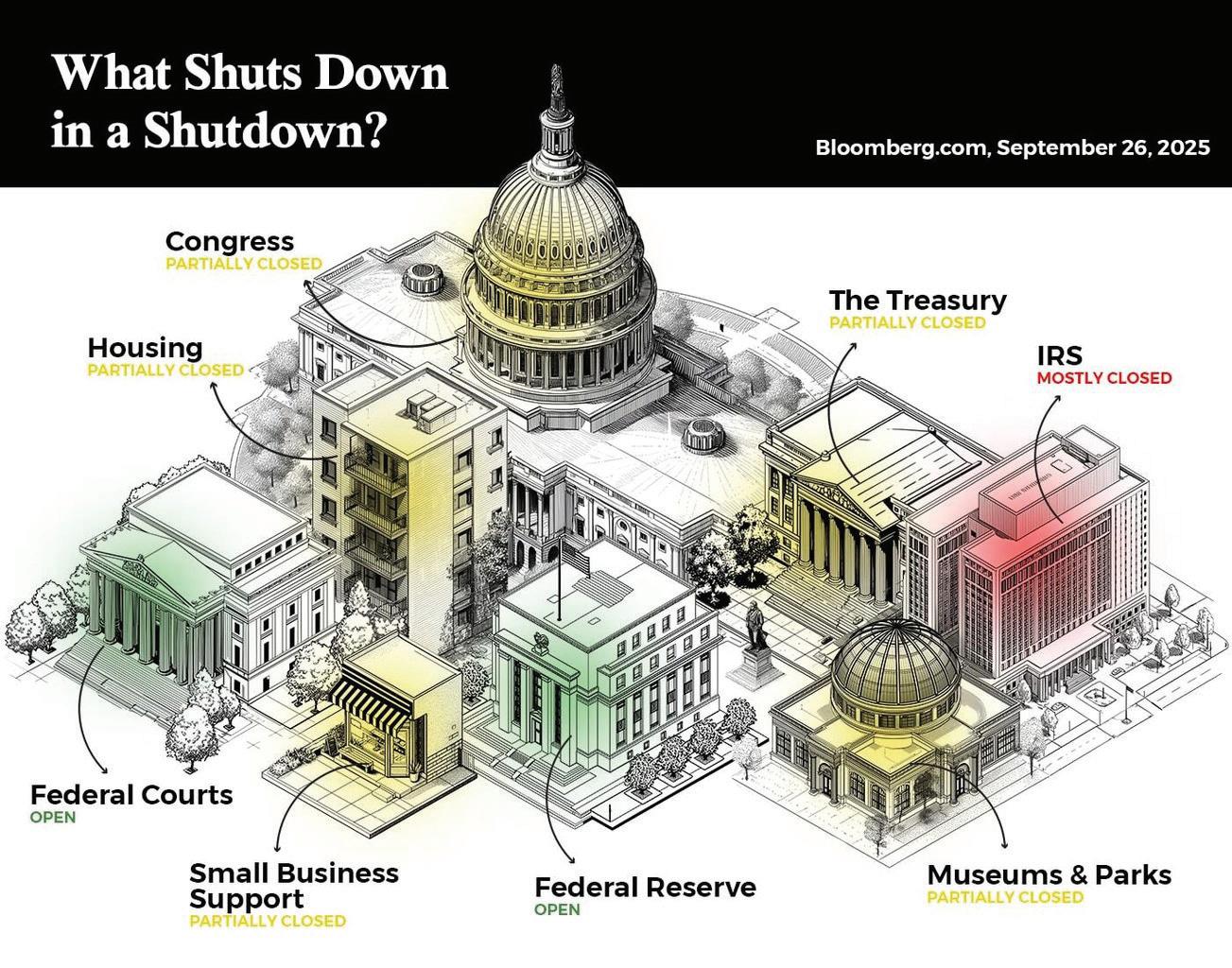 Federal offices may close or reduce hours, and “non-essential” services pause.