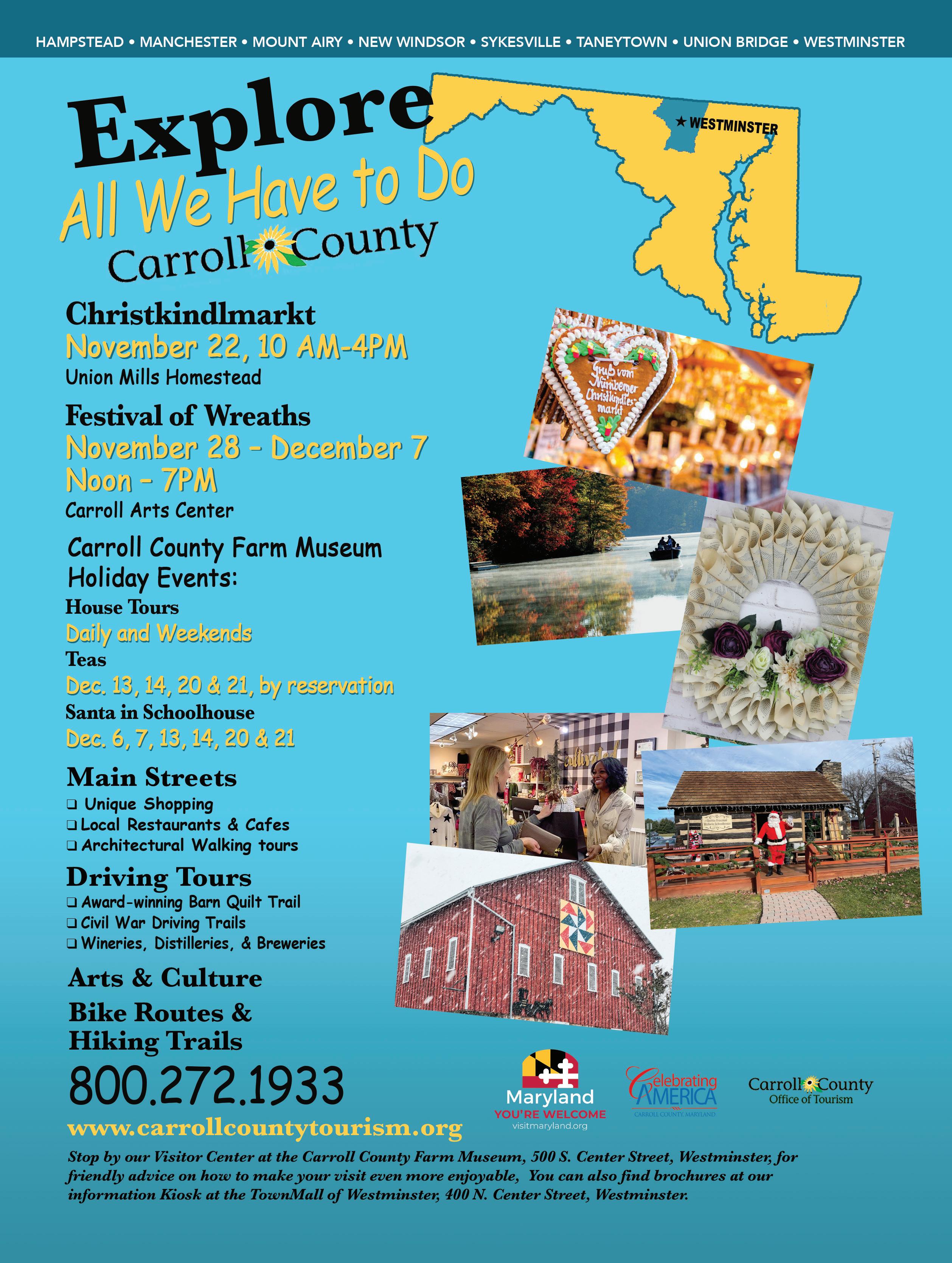 Carroll Creek Linear Park, Downtown Frederick. Carroll Creek is lit up with boats sponsored by local businesses for observers to enjoy. The fleet sets sail at a kick-off event with music and food trucks on Nov. 22 at 8 a.m. 301-5141182. www.coloronthecreek.com/sttws