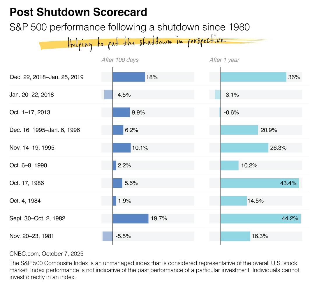 During times like a government shutdown, market historians will look back to see what has happened in the months and years following a resolution to the event. The accompanying chart shows you what has happened in the stock market during the 100 days and one year after a shutdown. Past performance is no guarantee of future results.
