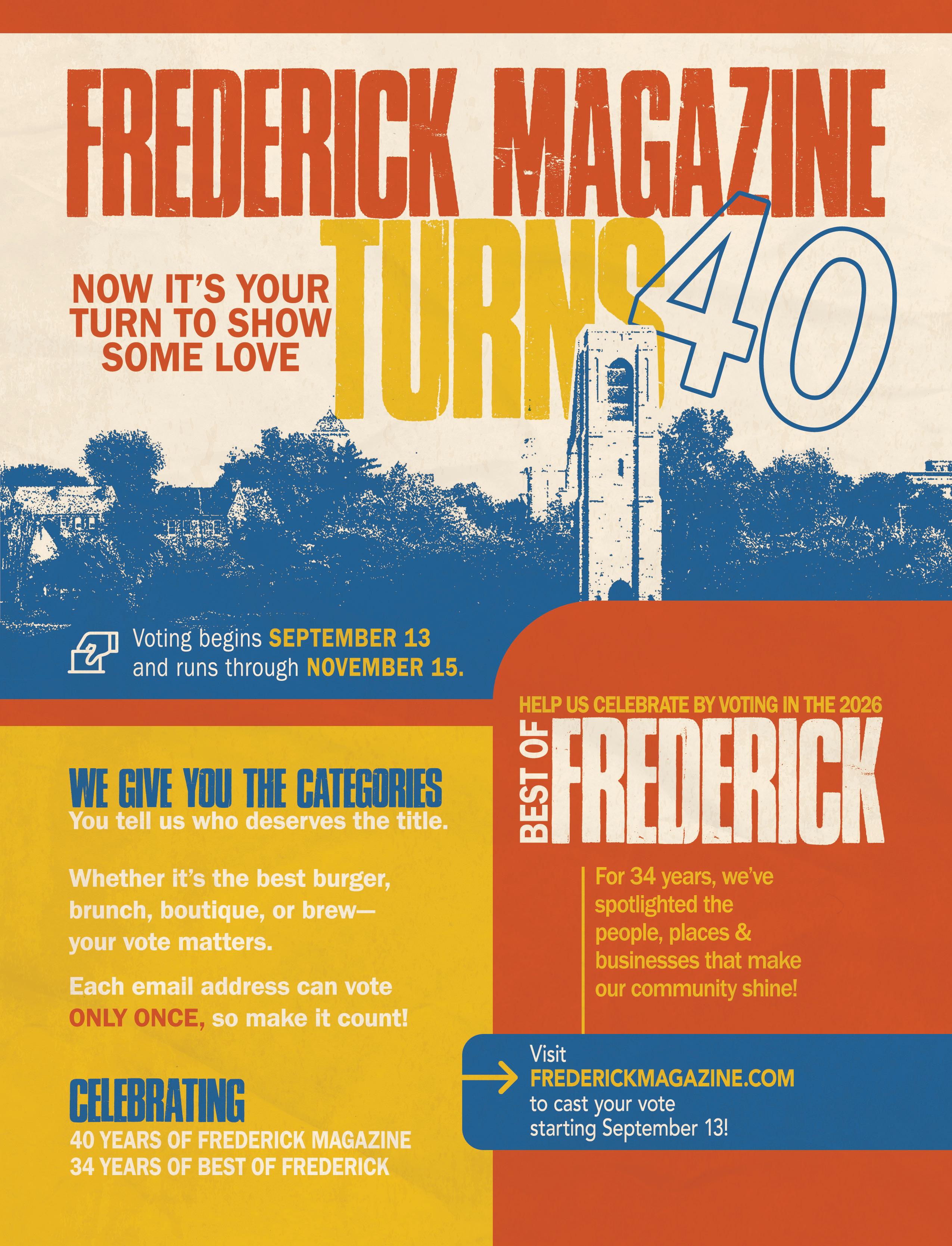 My story, “It’s Complicated,” starts on page 48. I hope you enjoy it and the rest of this month’s issue of Frederick Magazine. Also, don’t forget that “Best of Frederick” voting starts this month on Sept. 13, so go to www.fredmag.com to make your voice heard.