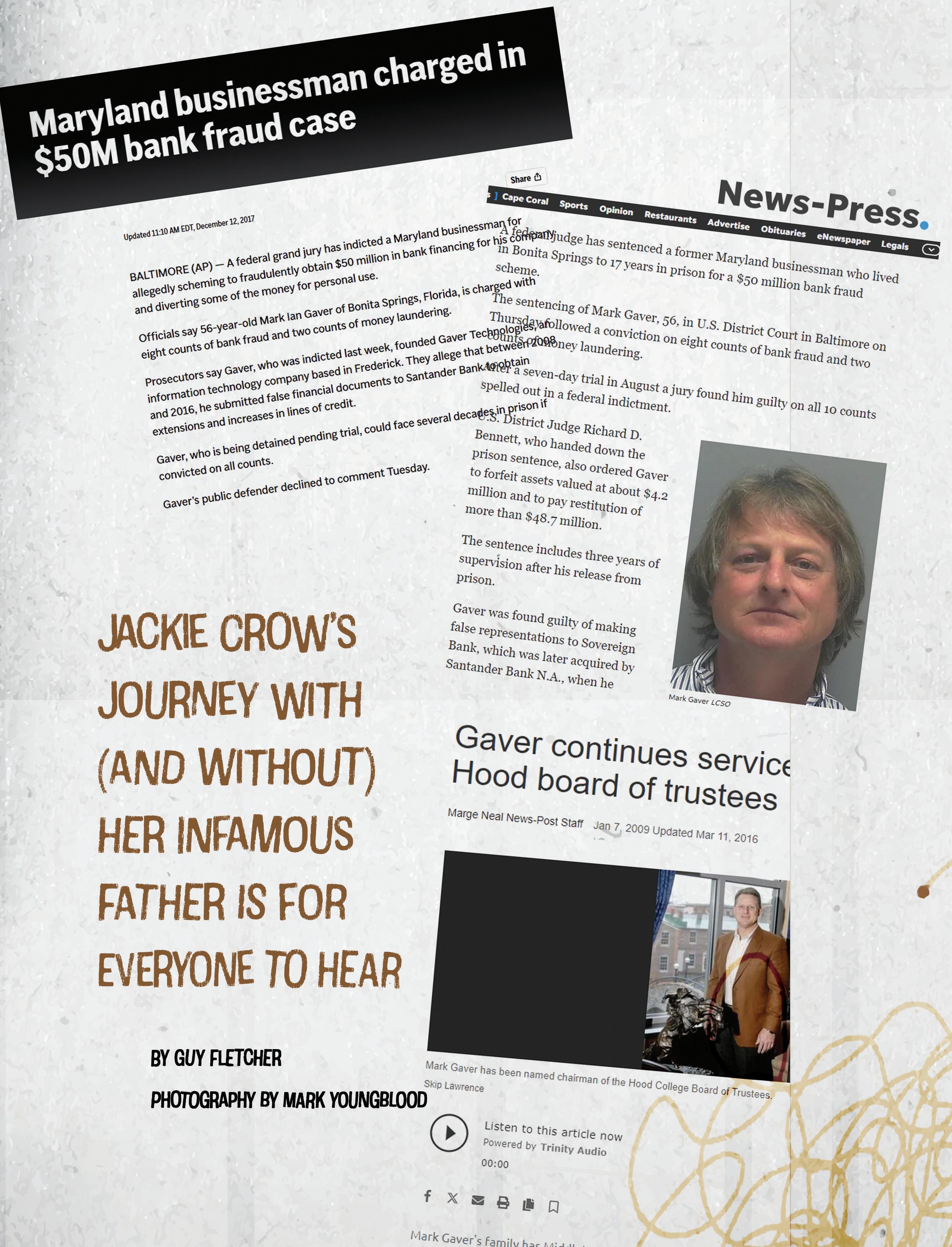 Another story I have always wanted to write was about Mark Gaver, a well-known local figure and seemingly successful businessman who was convicted of bank fraud and money laundering in 2018. From the surface, I thought Gaver’s tale was a classic Greek tragedy spiced with a hefty dash of American consumerism. I caught a break earlier this year when Jackie Crow, Gaver’s daughter,