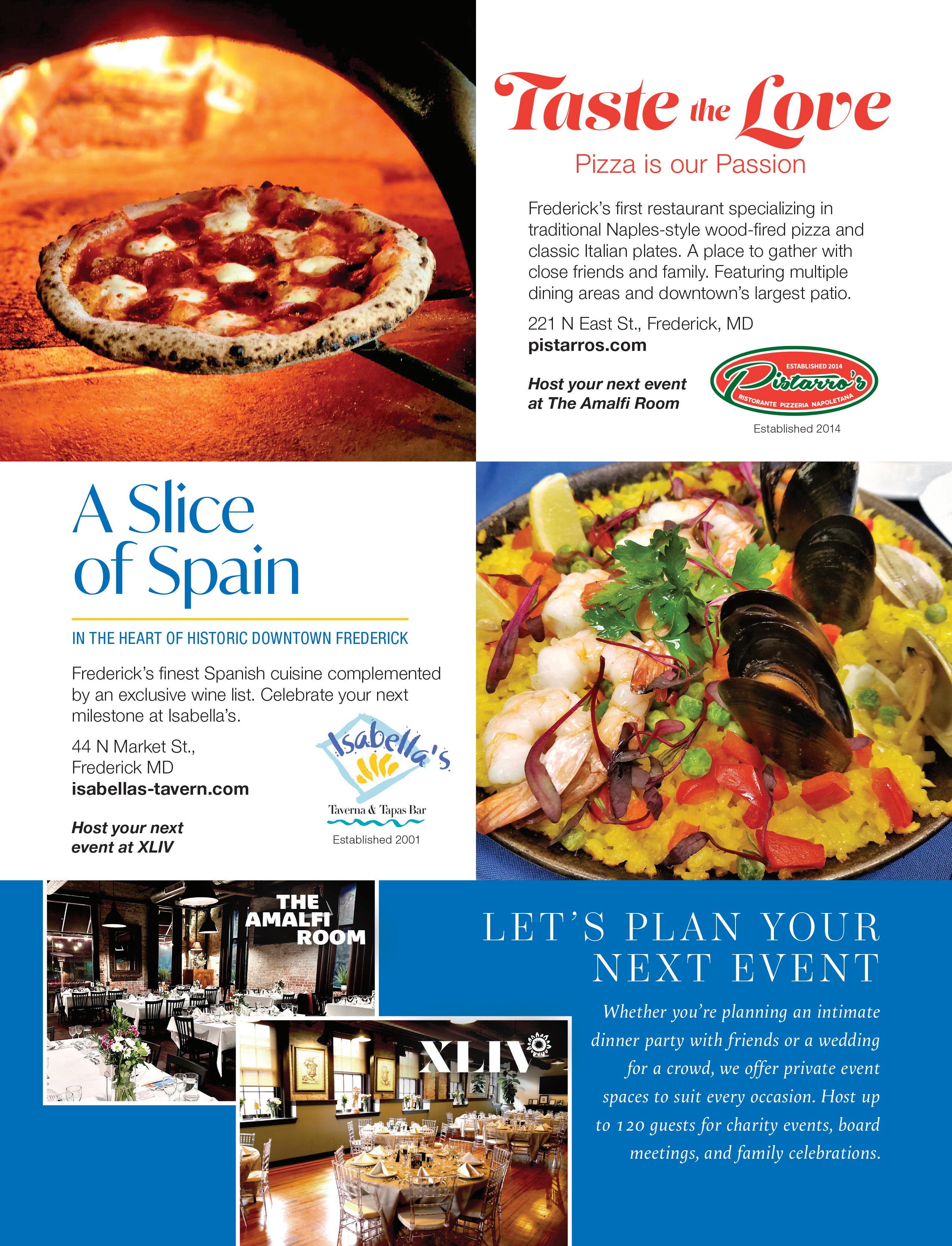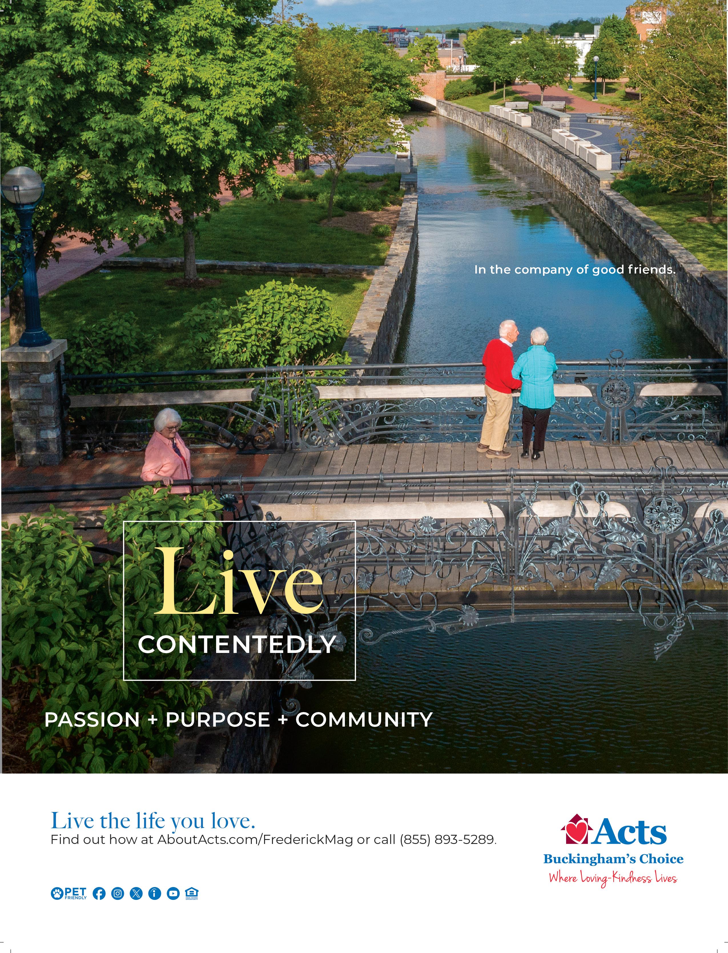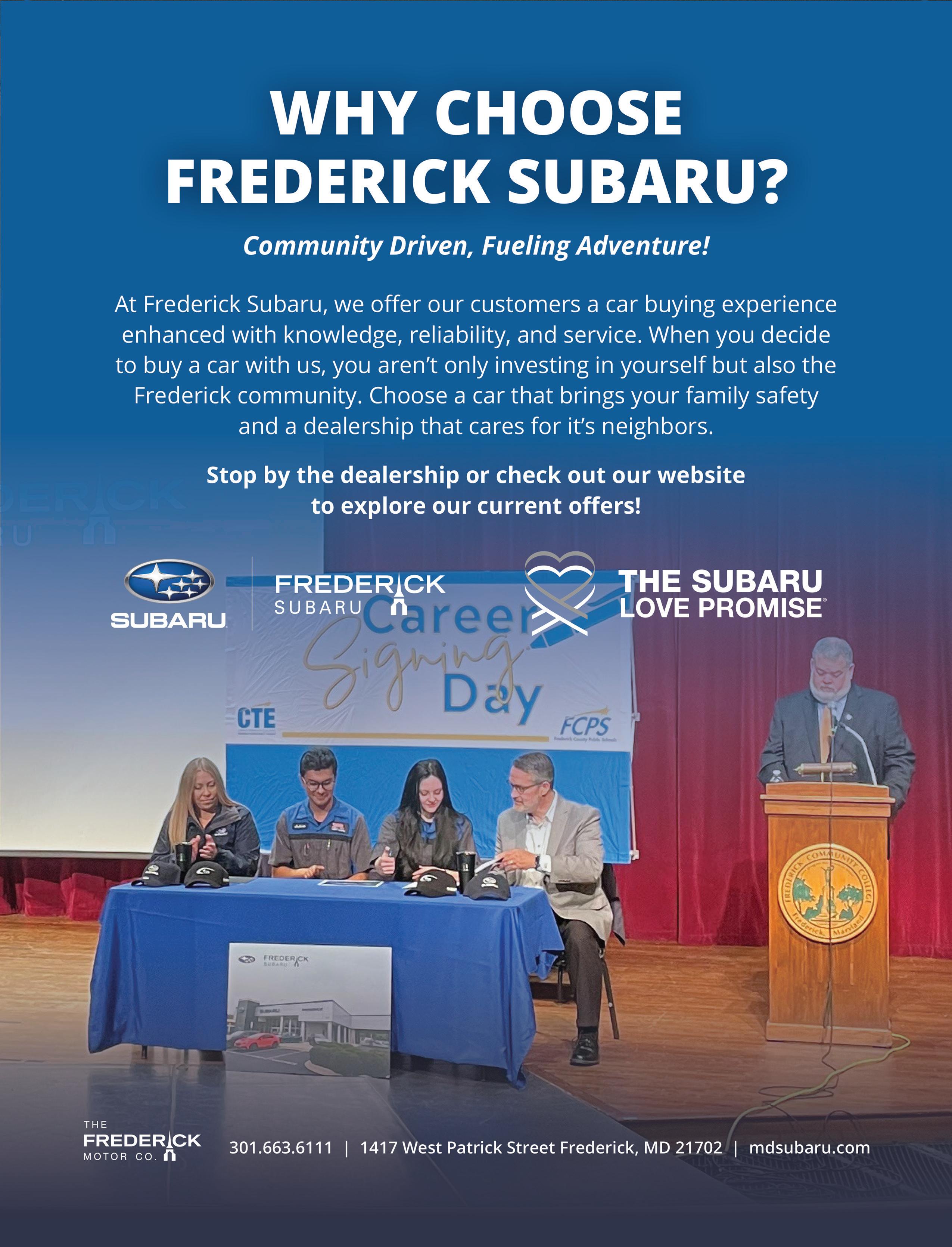 4 fredMAG MAGAZINE PUBLISHERS Shawn Dewees / Joseph Silovich Editor-in-Chief Guy Fletcher Assistant Editor Nancy Luse Graphic Designers Ian Sager Alexandra Werder Contributing Writers Jeanne Blackburn Amy L. Metzger Hunt Jody Brumage Jeni Lubbert Lisa Gregory Christine Van Bloem Scott Grove Jake Wynn Contributing Photographers Michael DeMattia Ellen Jester Turner Photography Studio Advertising Account Executives Terri Davis / tdavis@fredmag.com Shawn Dewees / sdewees@fredmag.com Stephanie Dewees / stephdewees@fredmag.com Debra Tyson / dtyson@fredmag.com Distributor Josh Ensor / alloutdist@fredmag.com Subscriptions Stephanie Dewees / subscriptions@fredmag.com Events Calendar and Proofreader Niki DeSanto / events@fredmag.com Telephone: 301-662-8171 FAX: 301-662-8399 WWW.FREDMAG.COM Letters to the editor: editor@fredmag.com Frederick Magazine, Volume XXXIX, Number 4 is a monthly publication of Diversions Publications, Inc., 6 N. East Street, Suite 301, Frederick, MD 21701-5601 (ISSN 006-923). Periodicals postage paid at Frederick, MD 21701 and at additional mailing offices. Subscriptions, $24.95 per year, which includes the Frederick City/County Guide, Homegrown, and all other annual guides (available through the business office). Back issues w/in the last 12 mos./$3.95. Prior to 12 mos. ago/$7.00. POSTMASTER: Send address changes to Frederick Magazine, 6 N. East Street, Suite 301, Frederick, MD 21701-5601. Customer inquiries to same address or call 301-662-8171. Distributed through mail subscriptions, home delivery, and sold at newsstands and other locations in Frederick, Upper Montgomery counties, and throughout the Central Maryland region. Advertising rates available on request. Manuscripts, drawings, and other submissions must be accompanied by a stamped, self-addressed envelope. Frederick Magazine is not responsible for unsolicited material. All rights to submissions, including letters and e-mail, will be treated as unconditionally assigned for publication and copyright purposes and as subject to Frederick Magazine’s unrestricted right to edit and to comment editorially, unless otherwise negotiated with the author. © DIVERSIONS PUBLICATIONS, INC. 2024. Frederick Magazine, Best of FrederickTM, and People to WatchTM, are owned exclusively by Diversions Publications, Inc. All contents of this publication are protected by copyright and may not be reproduced in whole or in part for any reason without prior approval of the publisher. Frederick is a registered trademark of Diversions Publications, Inc. Printed on Recycled Paper ISSUE 466 ALYSSA | HAGERSTOWN toothmanorthodontics.com Hagerstown 301.791.1770 Frederick 301.662.3366 2023 Platinum Provider YOUR TEETH. LET’S GET ONE THING STRAIGHT.