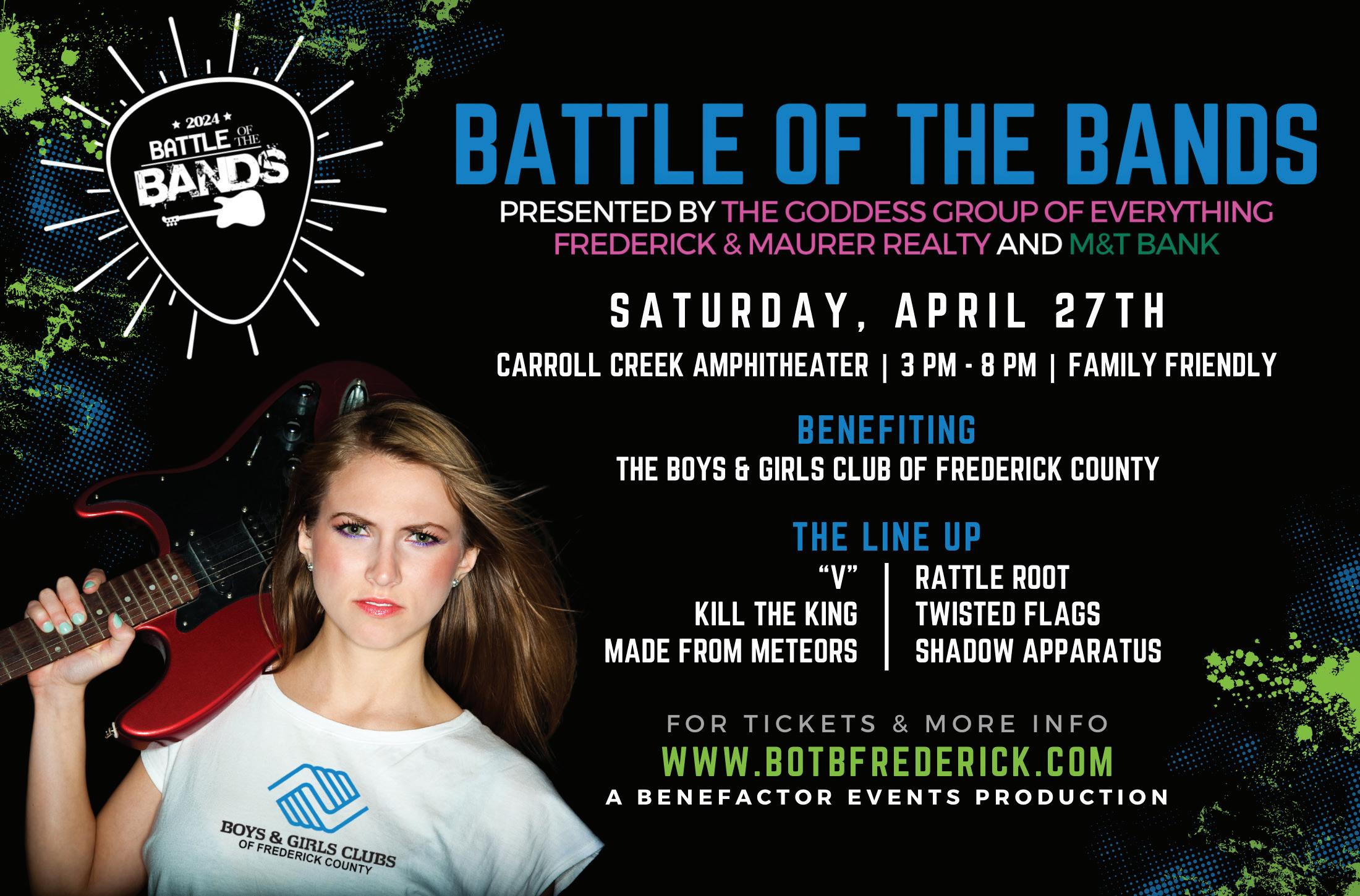 Carroll Creek Amphitheater, Downtown Frederick. Support the Boys & Girls Club of Frederick County at this event featuring a “battle” of six bands on stage, beer, food, games and more. 3 p.m.–8 p.m. www.downtownfrederick.org