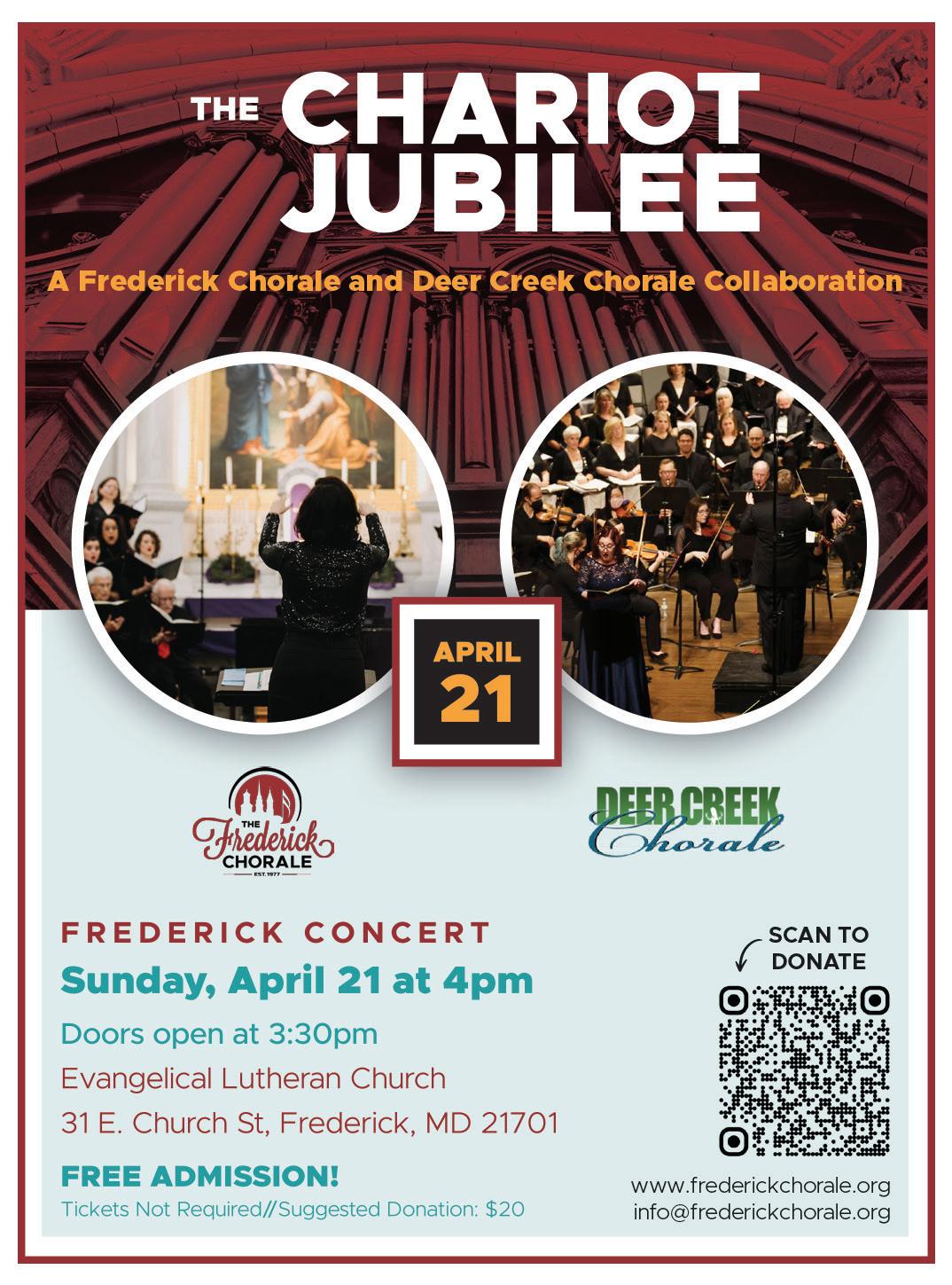 Evangelical Lutheran Church, 31 E. Church St. The Frederick Chorale, in collaboration with the Deer Creek Chorale, performs a collection of music titled The Chariot Jubilee, exploring the intersections between African American spirituals and the Latin Liturgy. 4 p.m. www.frederickartscouncil.org
