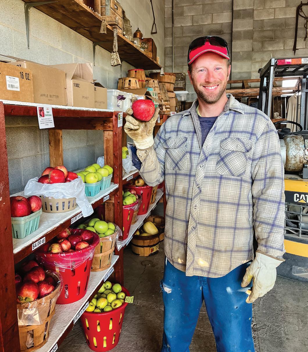 Brian Forsythe shows off one their apples in their produce storage area and market store.