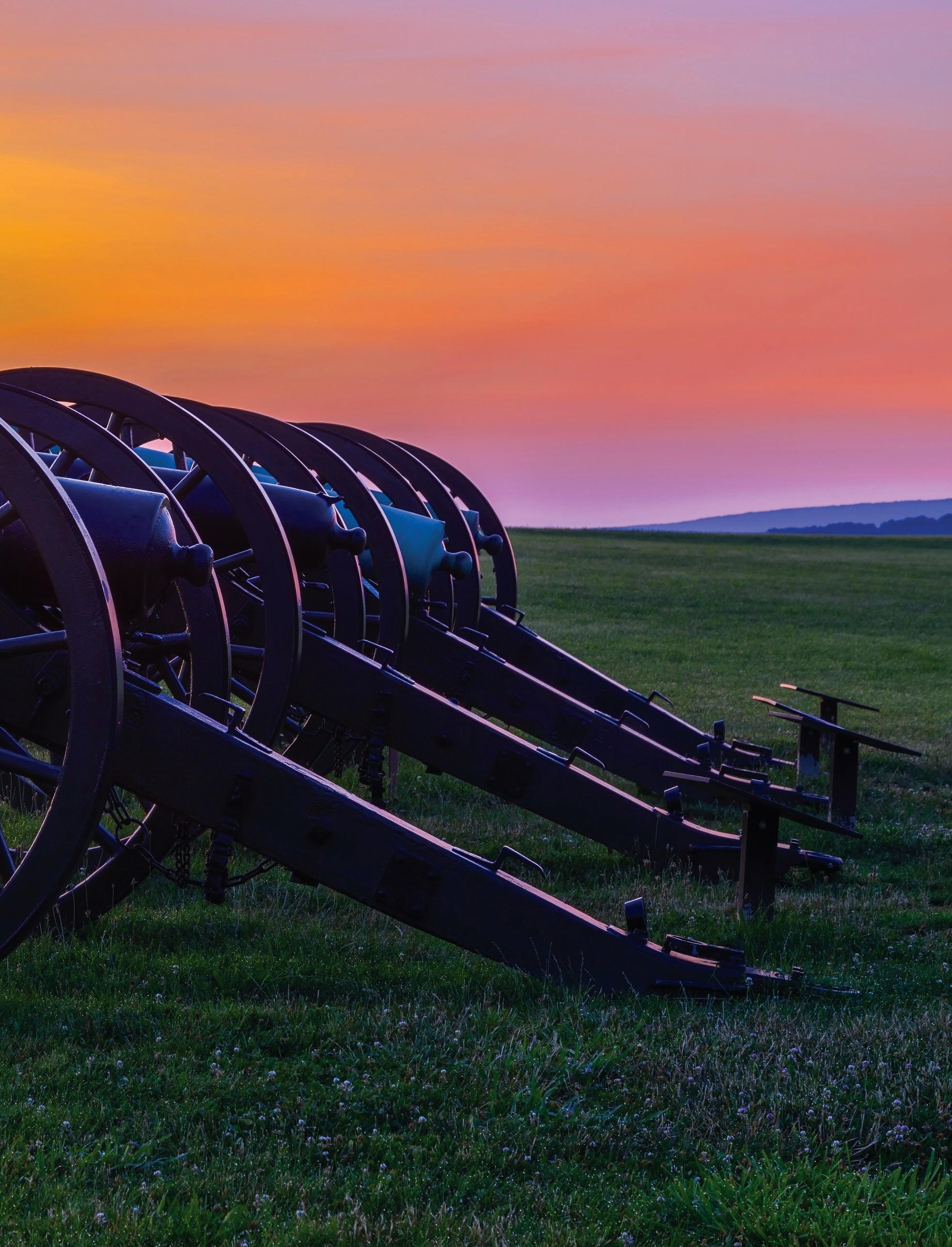 LONG SILENT, THE CANNONS USED IN THE BATTLE OF ANTIETAM STILL STAND AT ATTENTION AS A SPRING SUN rises again over the site of America’s bloodiest day. On September 17, 1862, Sharpsburg became the stage for the harrowing battle, which saw more than 22,000 casualties in that single day. The story is ingrained in the history of Washington County and America as the brutal fight marked by devastating losses on both sides. The Confederates were ultimately forced to retreat, though neither side could claim a decisive victory. The aftermath of Antietam, however, proved a turning point, as President Abraham Lincoln used the Union’s strategic success to issue the Emancipation Proclamation, altering the course of the Civil War and the nation’s future. Today, the stillness of the battlefield serves as a solemn reminder of the profound sacrifices made in the pursuit of freedom and union.