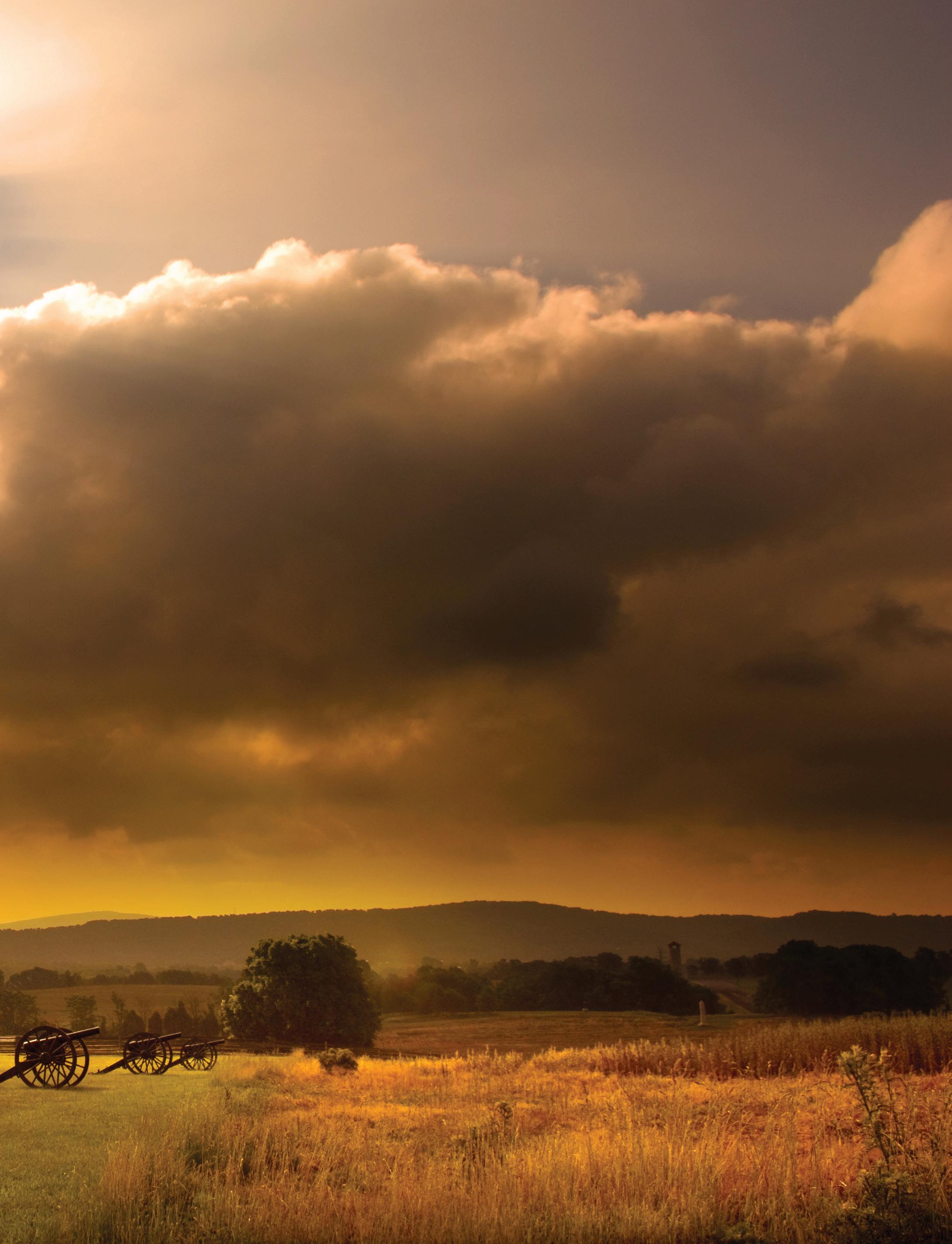 THE NATURAL BEAUTY OF WASHINGTON COUNTY OFTEN REVEALS ITSELF AT THE ANTIETAM NATIONAL Battlefield. Here, a late-summer storm moves across the historic site. Fall is a popular time for visitors to stroll through the battlefield near Sharpsburg. The battlefield averages about 205,000 visitors each year, although in 1986 a reported 700,000 people visited. Recently there has been a trend toward more people visiting Civil War battlefields, and the renovated visitor’s center at Antietam has helped visitors navigate the site of America’s bloodiest day.