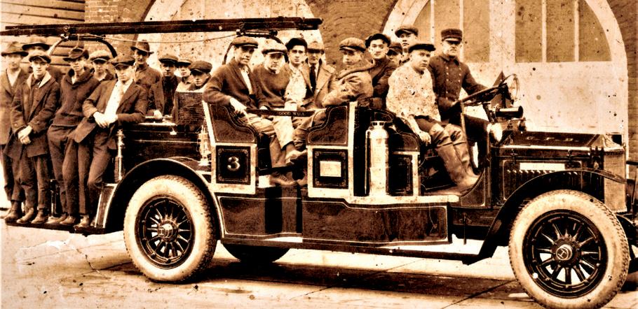 The gang’s all here: Members of the Good Will Fire Company No.3 of Chambersburg anxiously await their departure on the 1921 Hurlburt Service truck that was made in town by H.B. McFerren who is the driver shown in the picture.