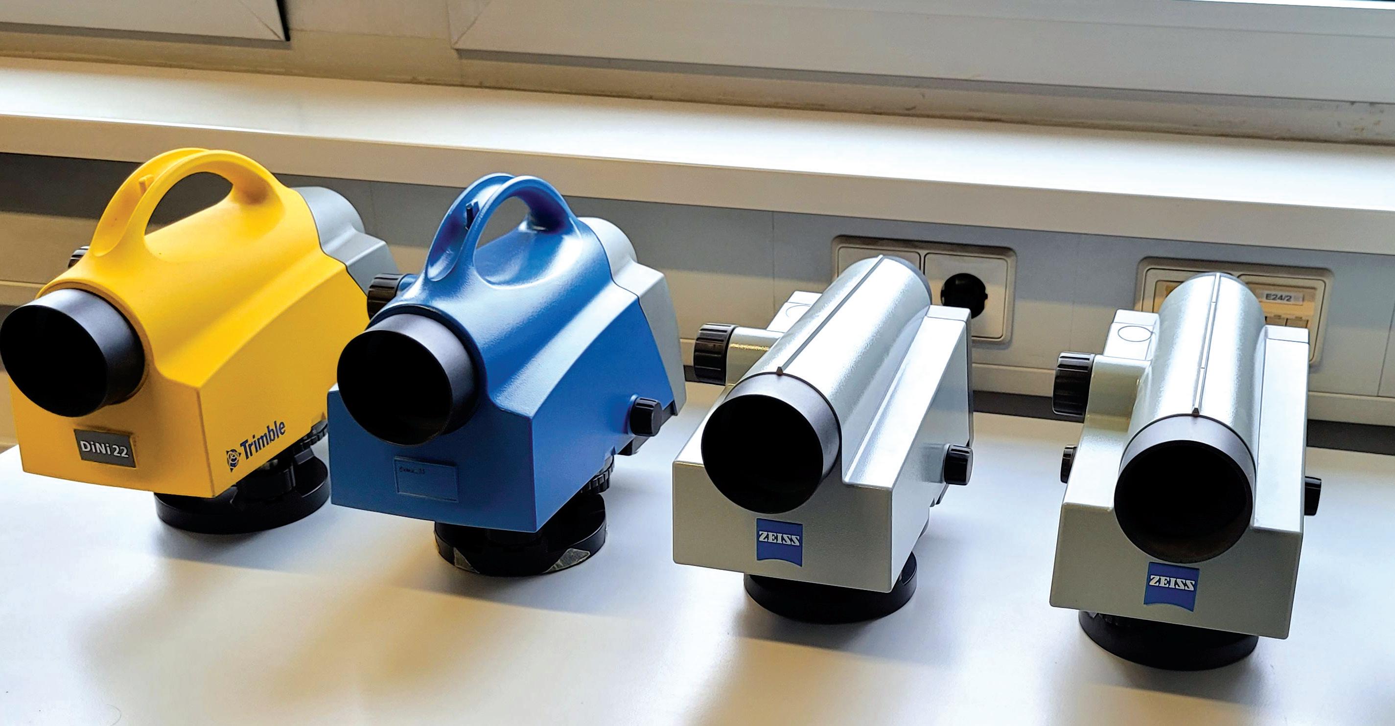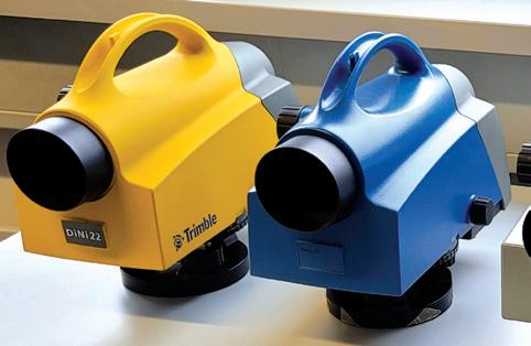 An evolution of digital levels, with the pioneering analog Zeiss Ni002 (right) and Trimble DiNi (left).