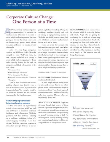 at wellpoint, diversity is a key component of the corporate culture. To maximize the similarities and differences of associates to create a high-performing culture, the company goes beyond the typical components of diversity—age, gender, sexual orientation, race, and color—to include diversity of thought. after two very large companies, anthem and wellpoint health networks, merged to form wellpoint, inc., the new company embarked on a journey to create a high-performing culture by design rather than by default. To that end, the company established a foundation of five core values: • Customer First • Lead Through Innovation • One Company, One Team • Personal Accountability for Excellence • Integrity. each of these core values has distinct guiding behaviors that describe ways to turn its words into action. “a promise made is a promise kept,” for example, would be an actionable behavior for the personal accountability for excellence value. Culture-shaping workshops, behavior-changing concepts The five core values are augmented by several culture concepts, which are tools and techniques to maximize individual fulfillment and effectiveness. wellpoint partnered with senn-Delaney leadership on a multiyear, multiphase rollout of a culture-shaping workshop. More than 40,000 wellpoint associates experienced the culture concepts firsthand at the in-