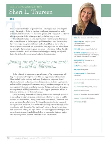 TITLE: Vice President, CSC Defense Division EDUCATION: BA, computer science, Concordia College; MBA University of Delaware FIRST JOB: Systems Analyst for DuPont WHAT I’M READING: Wikinomics: How Mass Collaboration Changes Everything, by Don Tapscott and Anthony D. Williams MY PHILOSOPHY: Find the fun in everything you do. FAMILY: Husband Dean; two daughters INTERESTS: Family time FAVORITE CHARITY: Make-A-Wish Foundation