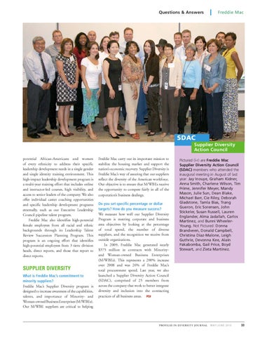 Freddie Mac carry out its important mission to stabilize the housing market and support the nation’s economic recovery. Supplier Diversity is Freddie Mac’s way of assuring that our suppliers reflect the diversity of the American workforce. Our objective is to ensure that M/WBEs receive the opportunity to compete fairly in all of the corporation’s business dealings.Diversity Do you set specific percentage or dollar targets? How do you measure success? We measure how well our Supplier Diversity Program is meeting corporate and business area objectives by looking at the percentage of total spend, the number of diverse suppliers, and the recognition we receive from outside organizations. In 2009, Freddie Mac generated nearly $375 million in contracts with Minorityand Woman-owned Business Enterprises (M/WBEs). This represents a 200% increase over 2008 and was 26% of Freddie Mac’s total procurement spend. Last year, we also launched a Supplier Diversity Action Council (SDAC), comprised of 25 members from across the company that work to better integrate diversity and inclusion into the contracting practices of all business areas. PDJ