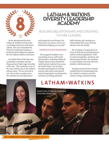 8 At the international law firm Latham & Watkins LLP, diversity is a fundamental tenet of the firm’s culture. This year it launched the Diversity Leadership Academy, a professional development program for law students and firm associates. As Global Chair of the Diversity Leadership Committee and San Diego partner, Nadia Sager describes it this way: “This Academy is one of the ways Latham says to law students and associates, ‘We are invested in you. We are here to support you. We celebrate the rich experiences
