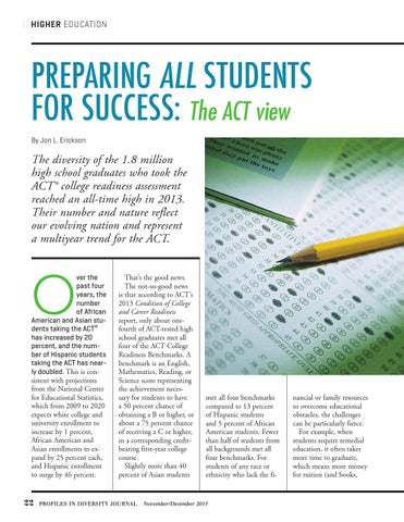 That’s the good news. The not-so-good news is that according to ACT’s 2013 Condition of College and Career Readiness report, only about onefourth of ACT-tested high school graduates met all four of the ACT College Readiness Benchmarks. A benchmark is an English, Mathematics, Reading, or Science score representing the achievement necessary for students to have a 50 percent chance of obtaining a B or higher, or about a 75 percent chance of receiving a C or higher, in a corresponding creditbearing first-year college course. Slightly more than 40 percent of Asian students