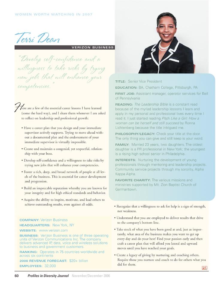 Terri Dean retired as senior vice president at Verizon but she hasn’t stopped working. She is vice chair of the board of trustees for the Ron Brown Scholar Program, which annually helps 40 to 50 African-American high school students by giving them $40,000 college scholarships and a lifetime of connection to mentors.