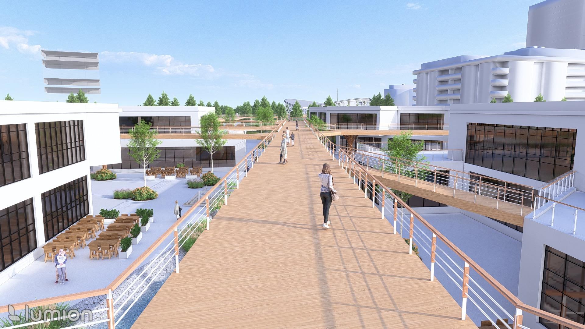 Elevated pathway connecting the Restaurant blocks on upper-level terraces.