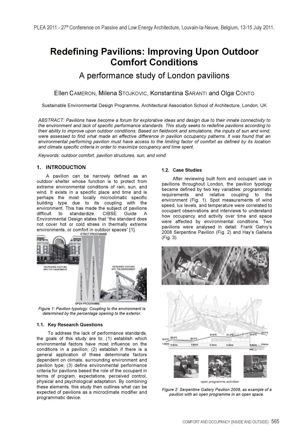 1. Cameron, E., Stojkovic, M., Saranti, K. & Conto, O., 2011. Redefining Pavillions: Improving upon Outdoor Comfort Conditions. PLEA 2011, pp. 13-15.