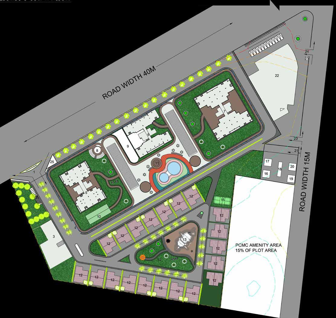 ROAD WIDTH 15M ROADWIDTH40M 1 2 3 4 5 6 7 8 9 10 11 12 12 12 12 12 12 12 12 12 12 12 12 12 12 12 12 12 12 12 12 13 14 15 16 17 18 20 19 21 22 MAIN ENTRY WAITING AREA CLUBHOUSE ENTRY TO COVERED PARKING 4BHK DUPLEX APARTMENTS 2BHK EXECUTIVE APARTMENTS 3BHK APARTMENTS AMPHI THEATRE ORGANIC GARDEN CRICKET PRACTICE PITCH SWIMMING POOL BUNGALOWS KIDS PLAY AREA SENIOR CITIZEN PARK BADMINTON COURT STP WTP VERMI COMPOST PITS TRANSFORMER DG SET SERVICE ENTRY/EXIT COMMERCIAL COMPLEX SERVICE ENTRY (COMMERCIAL) ENTRY EXIT (COMMERCIAL) SECURITY CABIN 1. 2. 3. 4. 5. 6. 7. 8. 9. 10. 11. 12. 13. 14. 15. 16. 17. 18. 19. 20. 21. 22. 23. 24. 25. FSI CALCULATION GIVEN TOTAL FSI = 46200 TOTAL BUILT UP OF THE FOLLOWING A. 2BHK / EXECUTIVE APARTMENTS= 10253 M2 B. 3BHK APARTMENTS= 9424 M2 C. 4BHK DUPLEX APARTMENTS = 11901 M2 D. BUNGALOWS = 6000 M2 E. AMENITY SPACE = 1100 M2 F. SERVICES = 80 M2 G. COMMERCIAL = 4500 M2 TOTAL AREA = A+B+C+D+E+F+G = 43178 M2 23 24 25 25 PCMC AMENITY AREA 15% OF PLOT AREA SITE DEVELOPMENT PLAN +592 +593 +594 +595 +596 +597 +598 +599 +600 GROUND HT FROM SEA LEVEL (M) COLOUR CODES CONTOUR LEGEND LEGEND