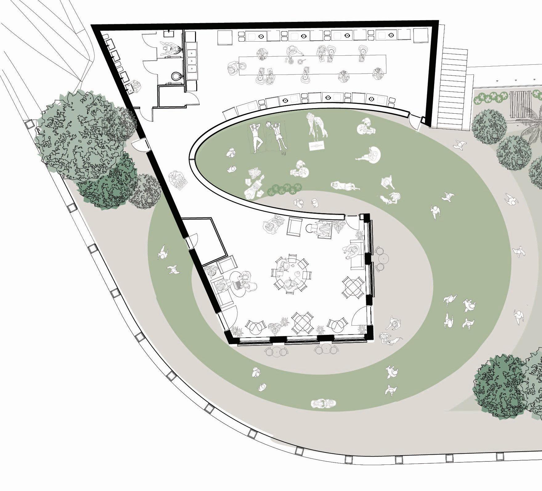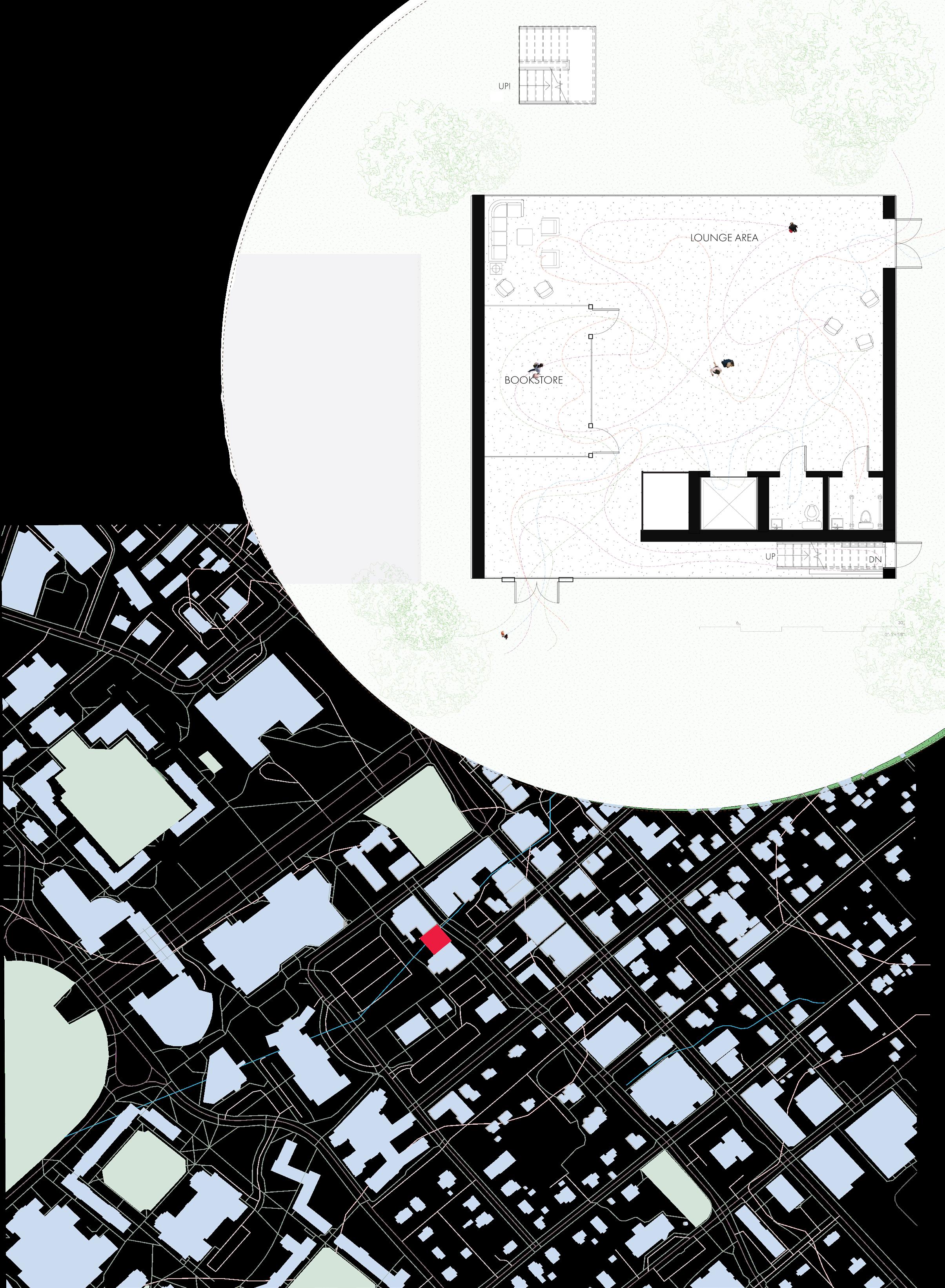 The CUBE aims to reimagine and revitalize an underutilized parking lot in the heart of Blacksburg. The surrounding area will be transformed into inviting greenspaces, offering a vibrant public gathering place for residents and visitors alike. By leveraging the landscape as an extension of the public realm, improving pedestrian flow and creating opportunities for informal gathering. A recessed ground level increases transparency and permeability at the street, while the copper-clad upper volume provides a durable material expression that establishes a clear institutional identity within the existing urban context.
