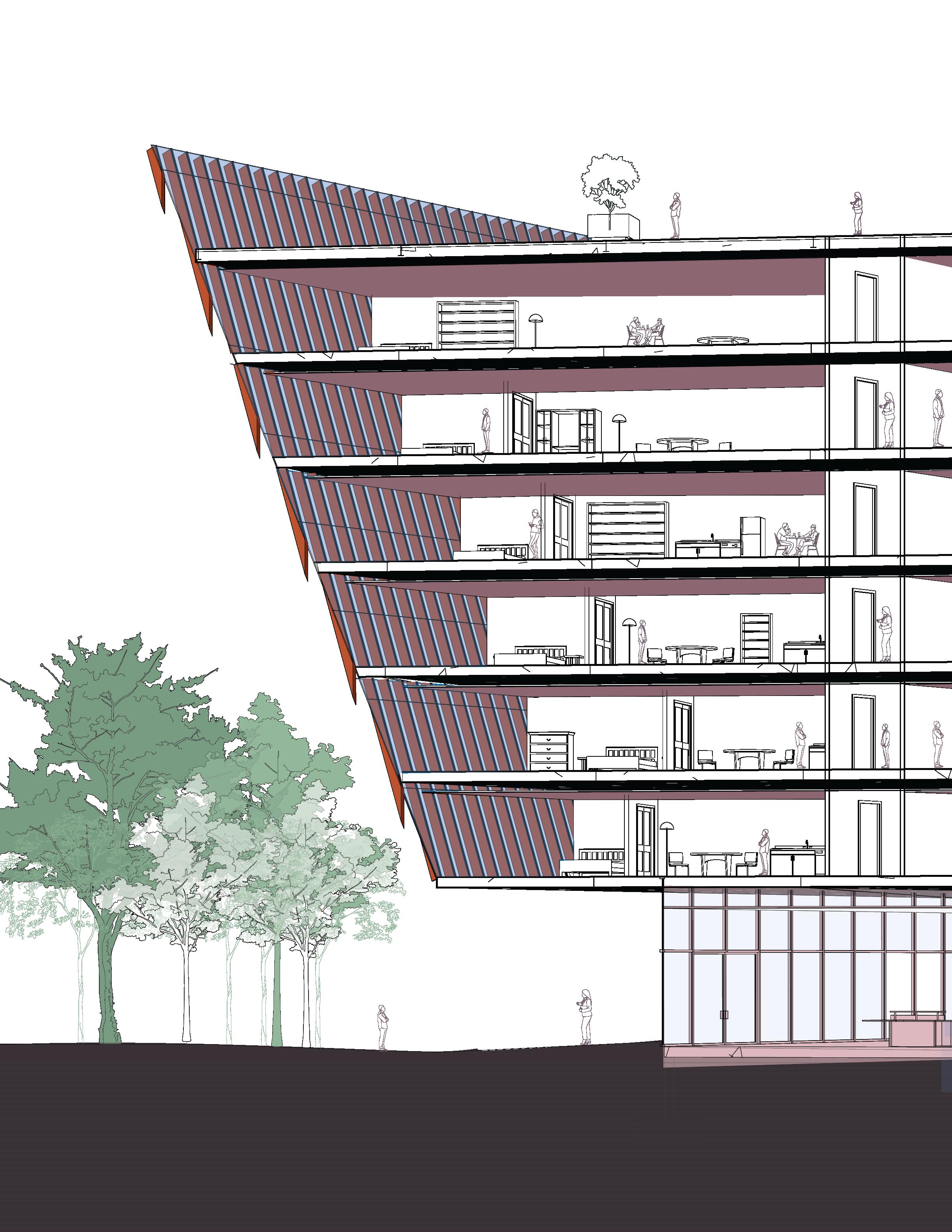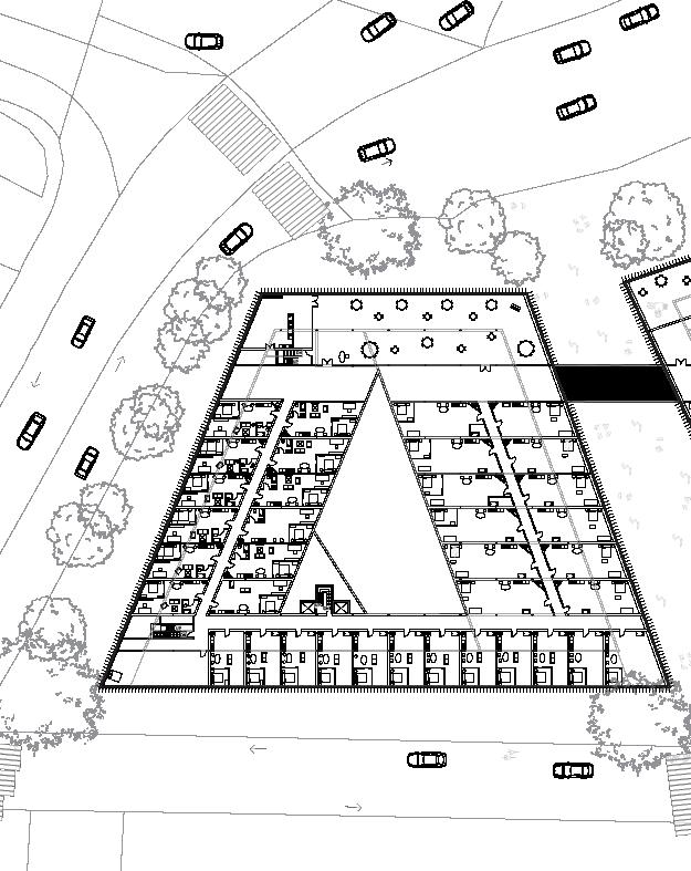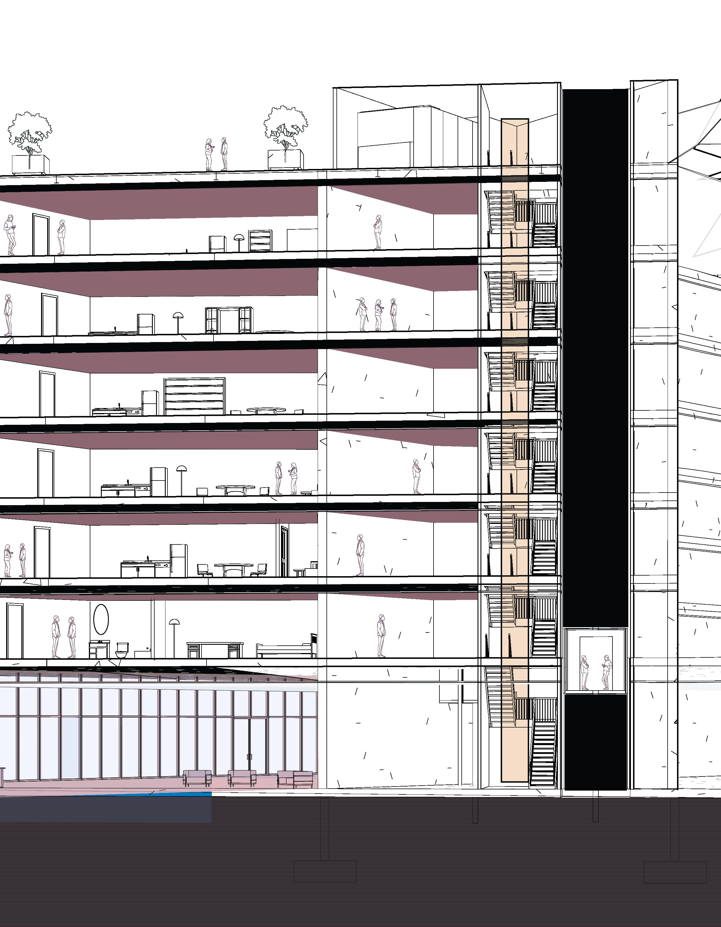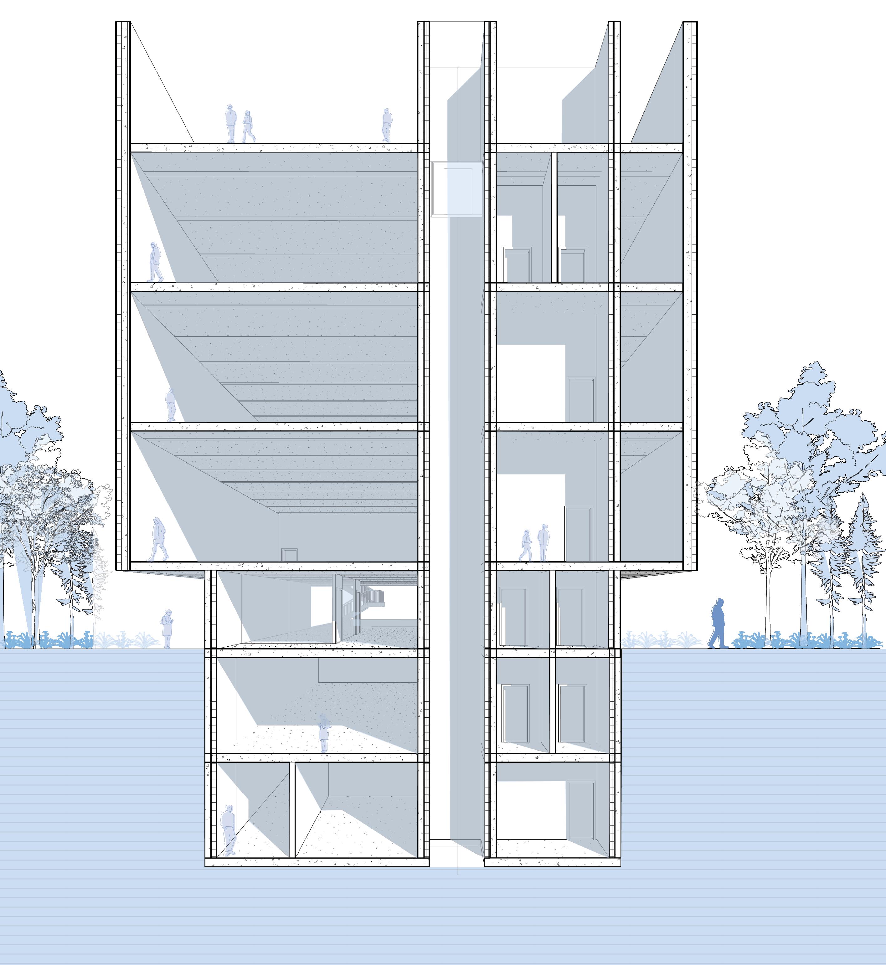 This project is a mixed-use residential building designed to serve both the public and senators, integrating living spaces with functional government areas. The arcade, provides a sheltered, pedestrian pathway along the ground level, linking the building’s public spaces with the surrounding area. This arcade enhances accessibility, guiding the public through the building while maintaining separation from the more secure spaces occupied by senators. The design fosters interaction between the community and the political process, ensuring transparency and openness. The upper floors house residential apartments within the building. The combination of mixed-use functions with a strong public connection ensures that the building serves as both a home and a civic hub