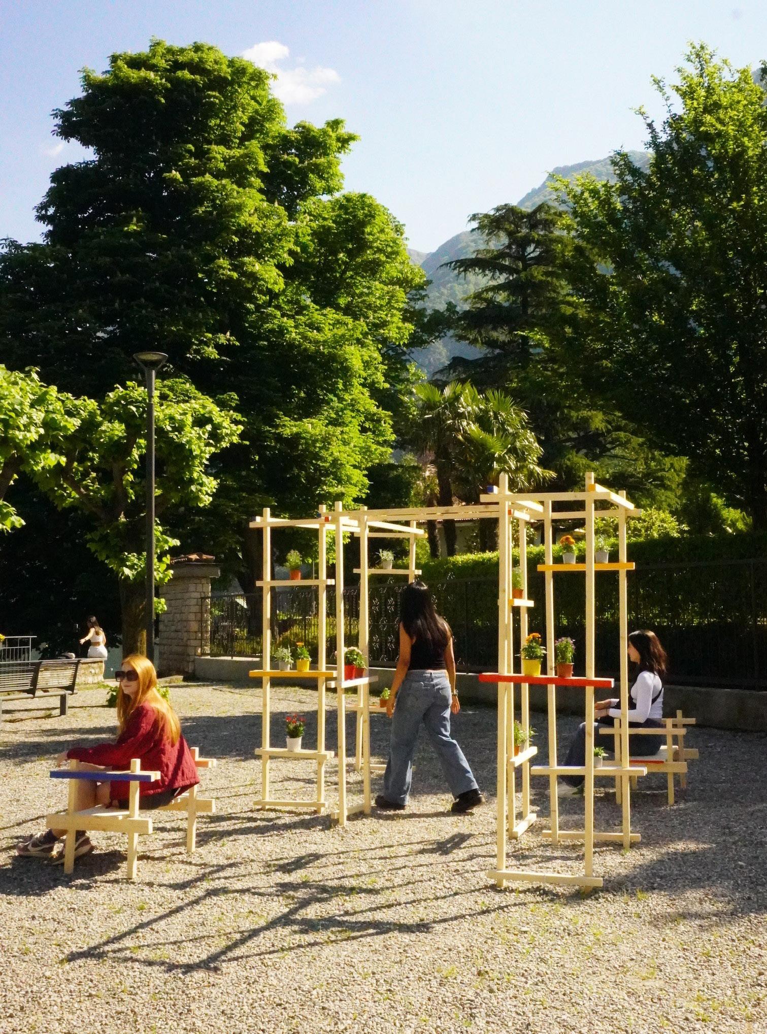 A temporary community pavilion in Riva San Vitale, designed and built in just one week by my 3 friends and I to give back to the community that had welcomed us into the town for a semester. Made from simple wood dowels found at the local hardware store into modular structures, the pavilion and two benches create an open, playful space for gathering, interaction, and pause. It’s modularity encourages people to change how they would like to make it a different experience for each person, and integrated plants were for the community to take home and remember us by!
