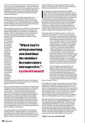 t’s maybe the measure of the band that, despite achieving commercial success and ubiquitous critical praise, it’s the hard graft that really gives them pleasure. “We were working our balls off around the time that the album came out. It was two gigs a day, running around doing instores, just doing anything and everything to promote it and everything being a little bit overwhelming,” says Carlos. “At the end of that week, when it had gone Top Ten in the UK and top five in Ireland, we’d sort of ended up in a reality that we never really imagined we could achieve. Getting there was really difficult, but the reward is that you feel a little bit of validation for the music, when you realise how many people want to hear it.” Part of the reason for ‘Dogrel’’s appeal - at least in the eyes of the commentators - is that it seems to speak to the times we’re living in; working class rage, the decline of community, and small-town frustration were all themes that observers were quick to pick up on. Yet Carlos still isn’t sure how accurate a portrayal that is. “While we were making it, I always thought of the album as being less political and more personal,” he suggests. “I think that it talks about feelings that are maybe suppressed by the world we live in - of stunted ambitions, and of feeling stuck in a certain place. I don’t think those are exclusive to Ireland or the UK, because we’ve been to Russia and America and had crowds singing those words back at us. No matter what the political context, in the capitalist world, there’ll always be a part of society that can identify with that. That’s why bands like IDLES are doing well wherever they go, too.”