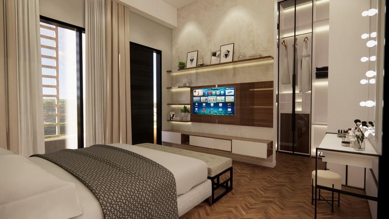 even a design is applied to the ceiling. A thinblack lines along the room gives off a luxurious atmosphere.