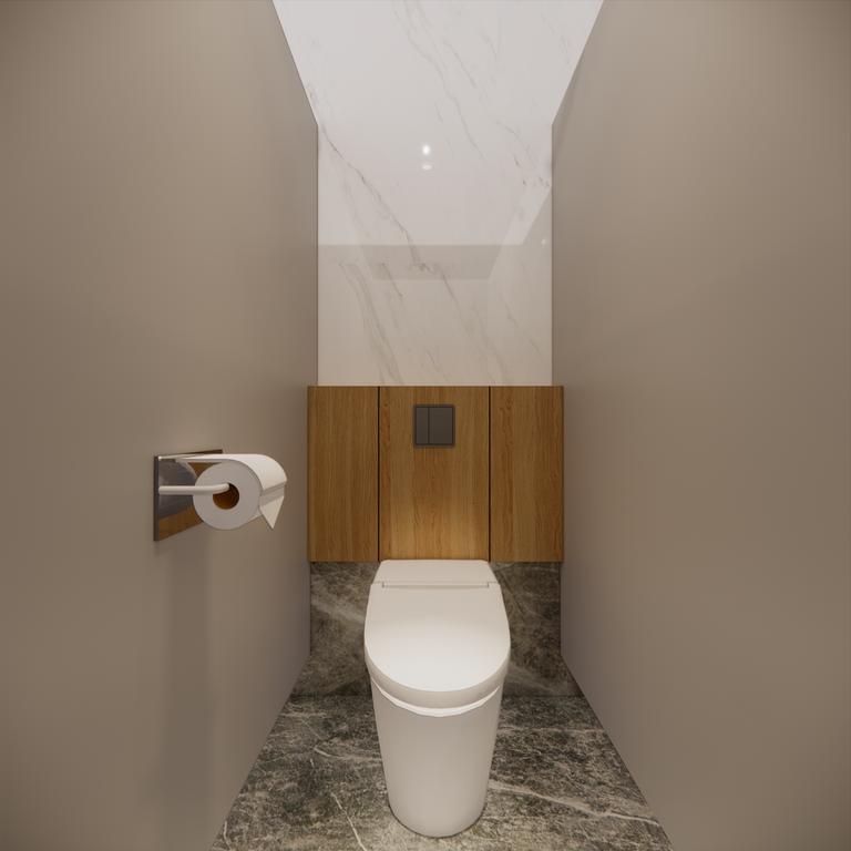 Wood, marble, clean, glossy, kind-of-look combined becomes a package for the toilet design